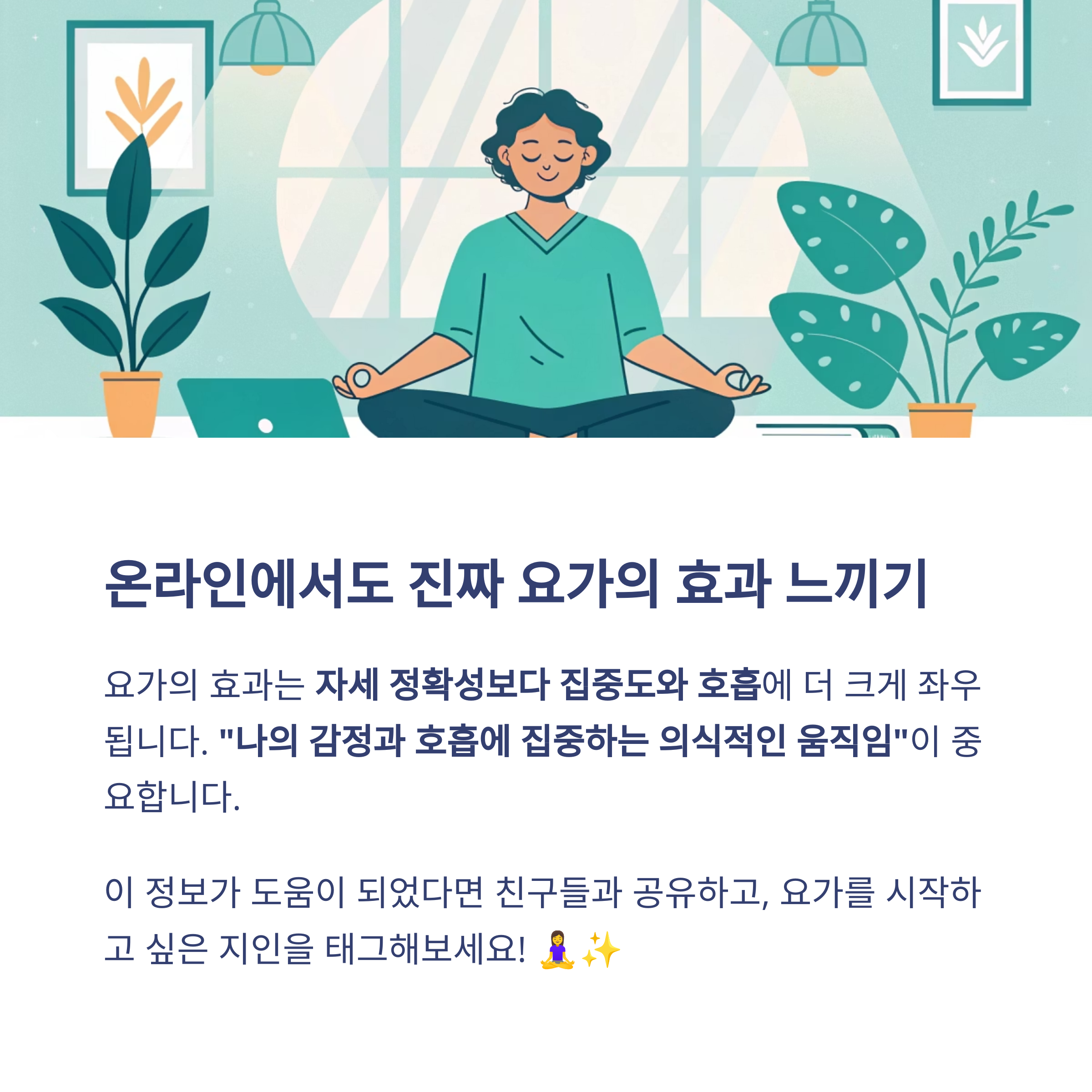 따라서 영상을 따라 하더라도, “나의 감정과 호흡에 집중하는 의식적인 움직임”이 중요합니다.