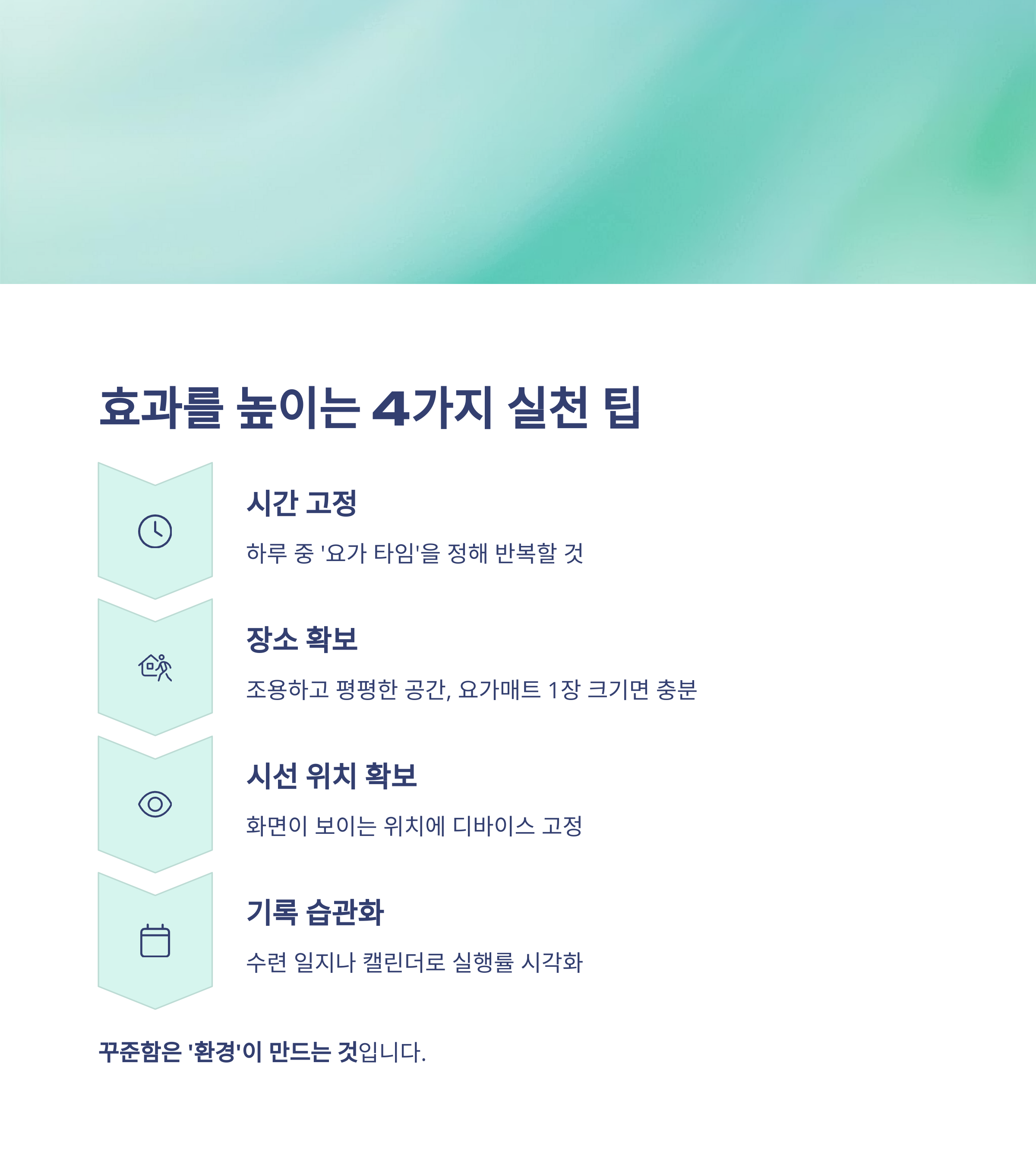 - 시간 고정: 하루 중 ‘요가 타임’을 정해 반복할 것