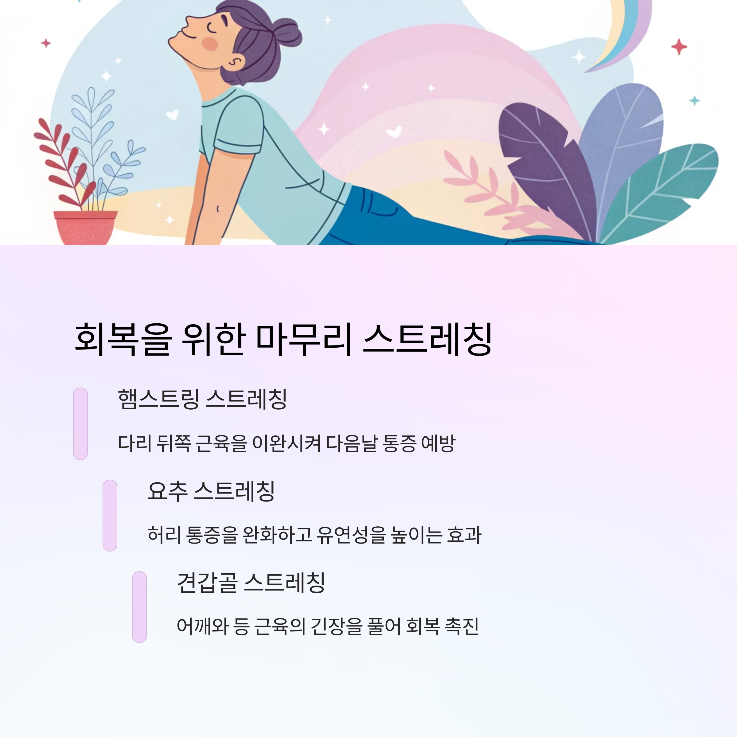 "스트레칭은 운동 후 통증 예방과 회복 속도를 높입니다"