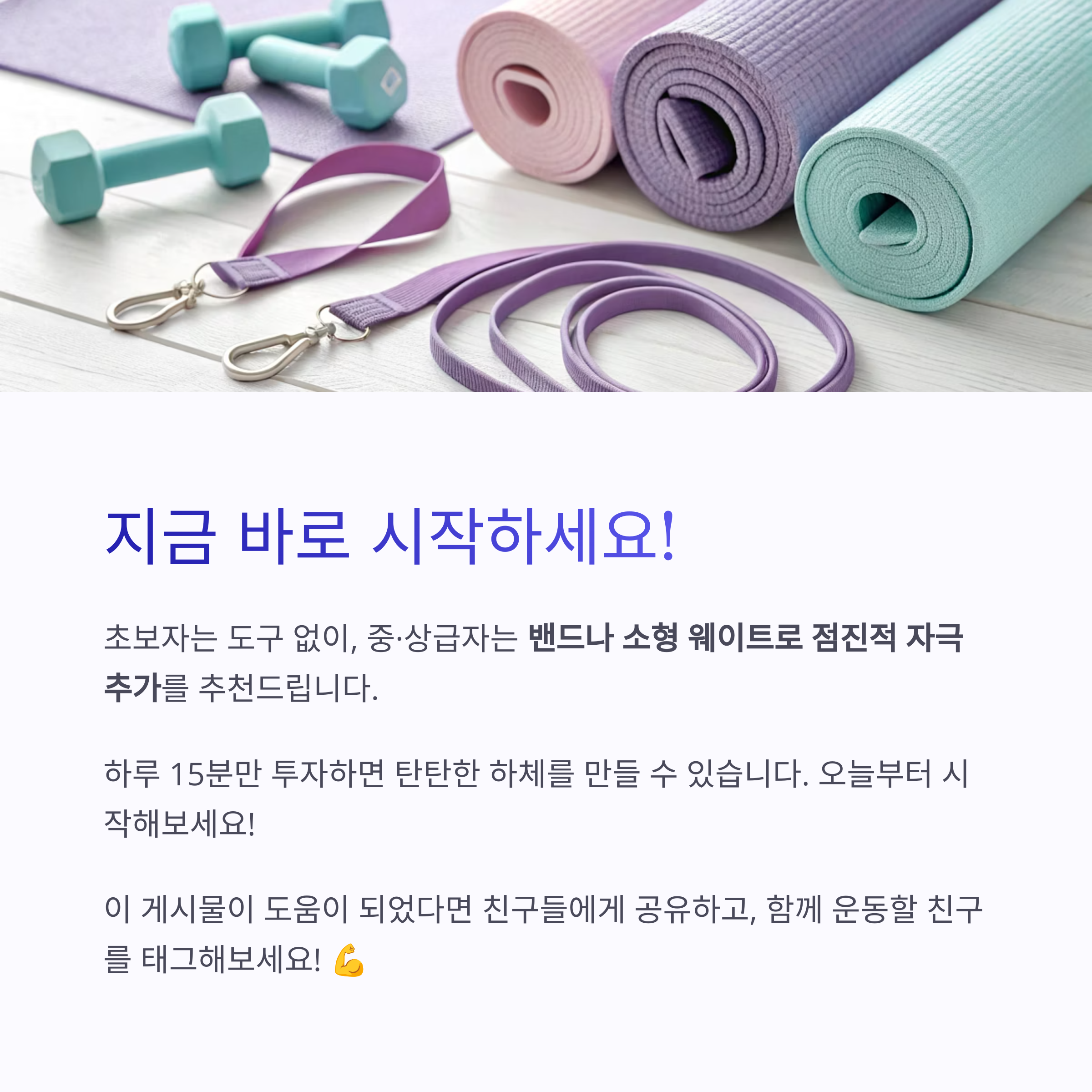 | 체중을 이용한 운동 (스쿼트, 런지) | 미니밴드, 덤벨 등으로 자극 강화 |