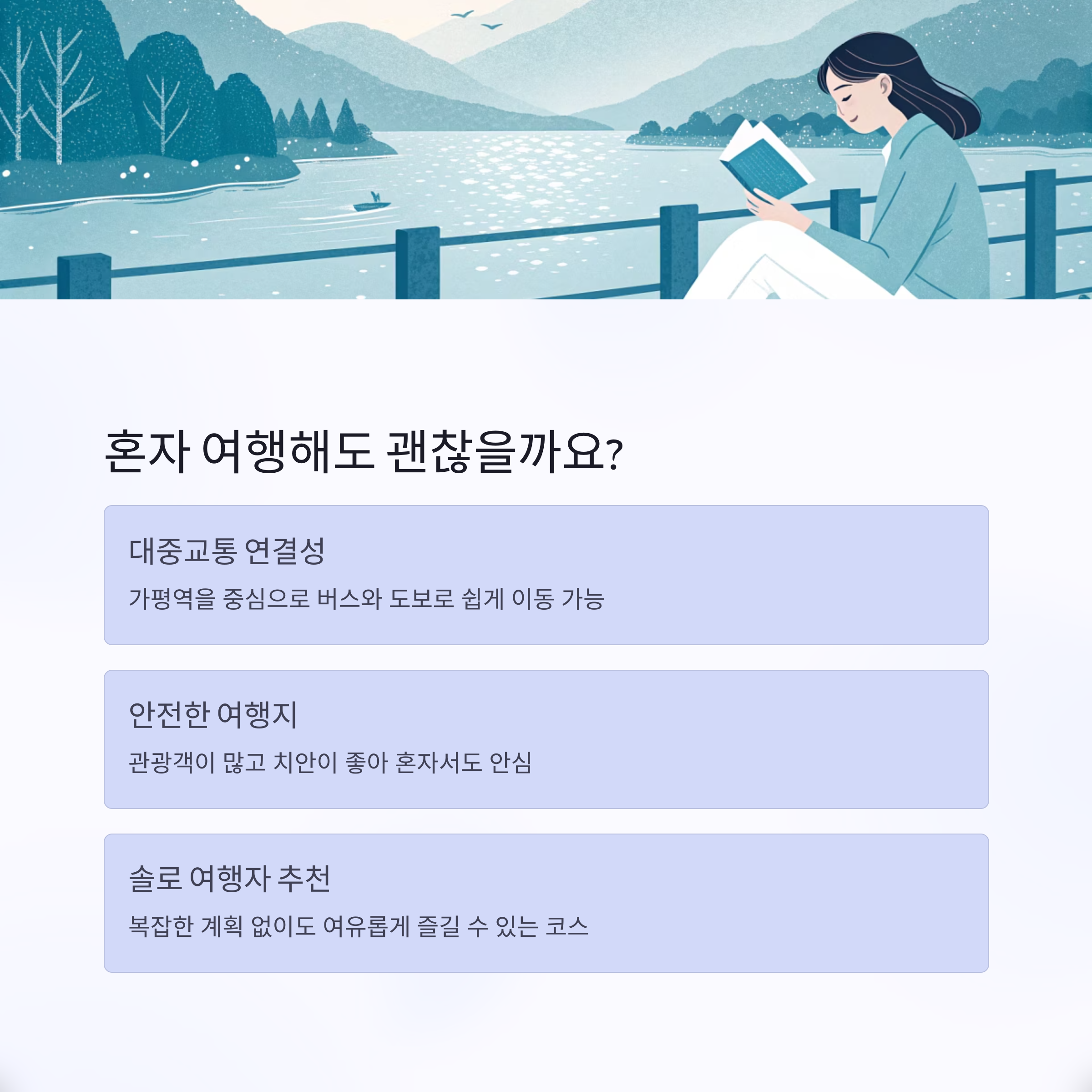 "가평은 혼자서도 충분히 편하게 다닐 수 있는 여행지입니다.