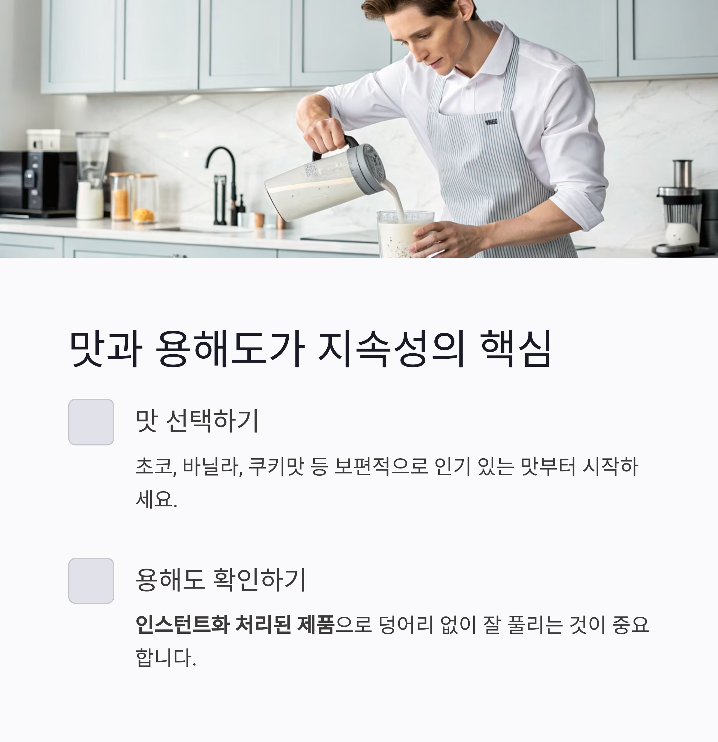 처음 먹는 보충제는 맛이 좋고 물에 잘 풀리는 제품을 고르는 것이 지속성의 핵심입니다.