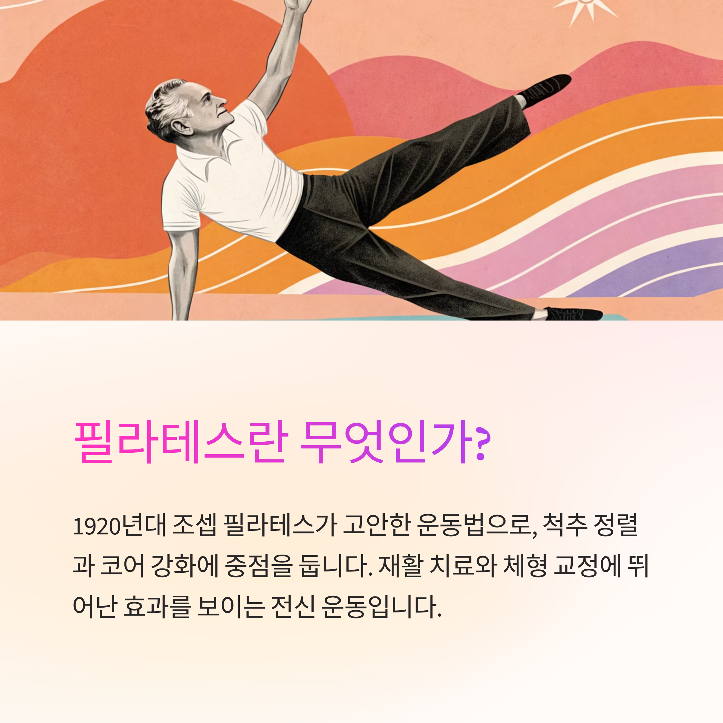 필라테스는 "코어 근육을 강화하고 몸의 정렬과 균형을 잡아주는 운동"입니다.