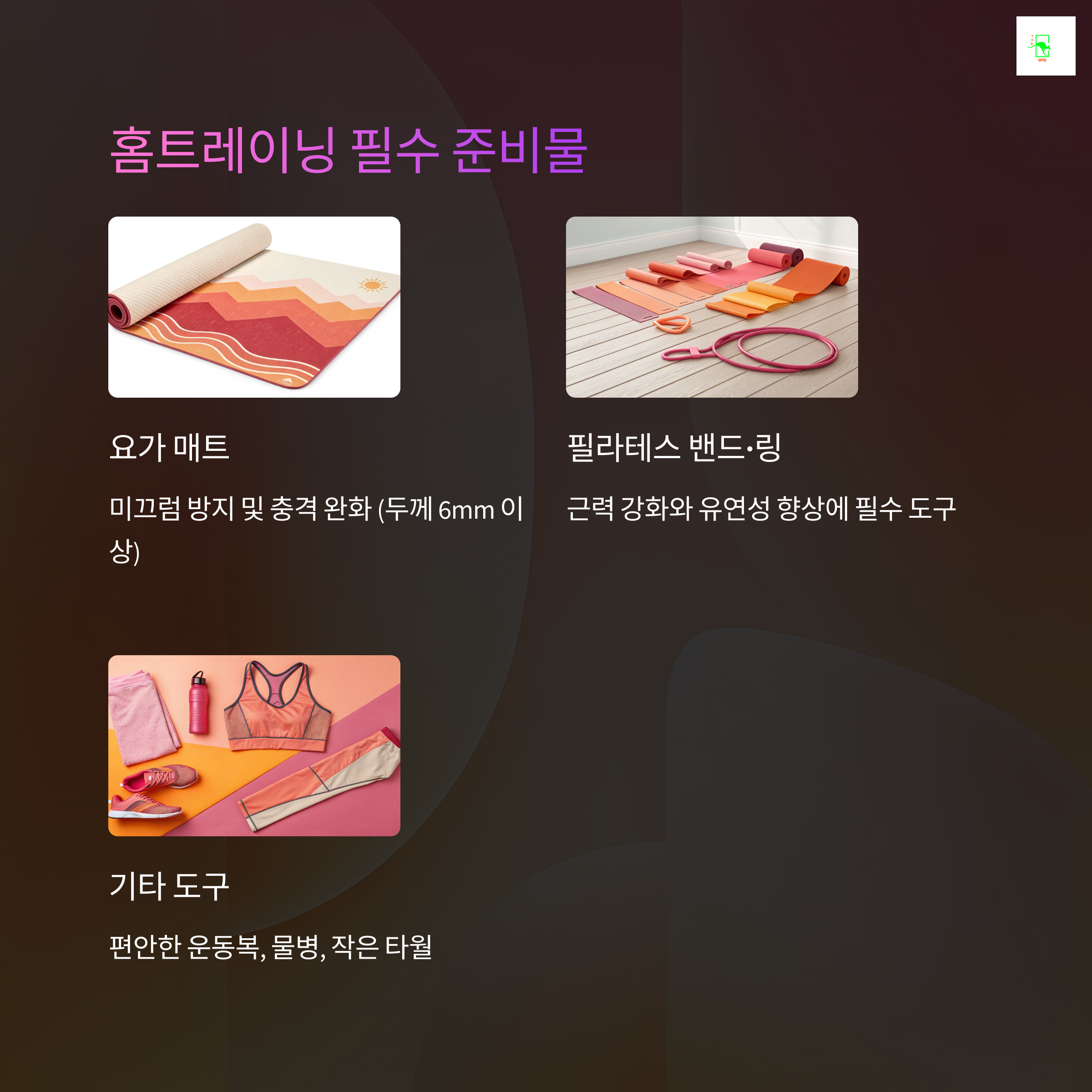 요가 매트, 필라테스 링, 미니 볼, 스트레칭 밴드 정도면 충분합니다.
