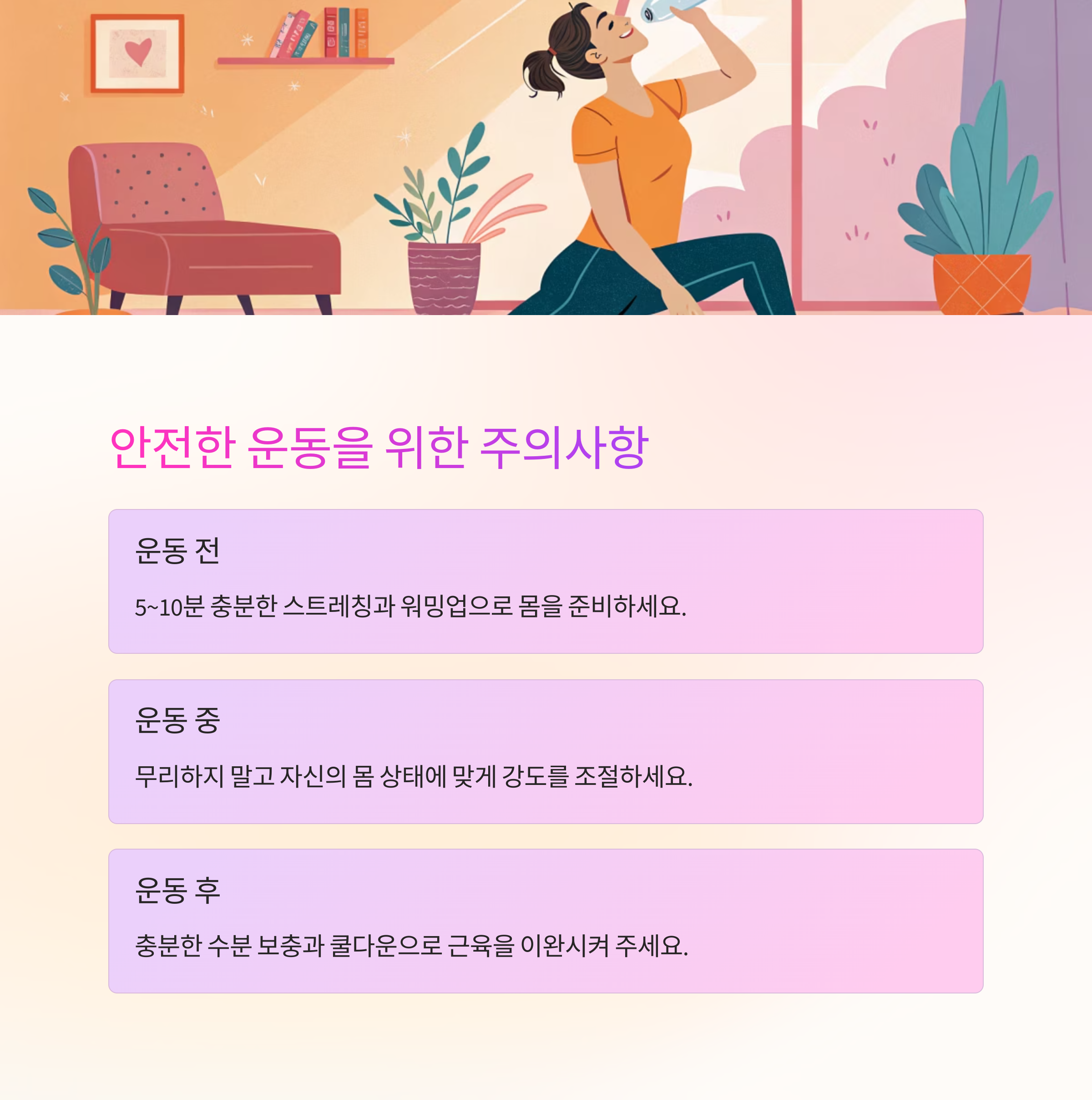 무리한 동작은 피하고, 몸의 신호를 항상 주의 깊게 들어야 합니다.