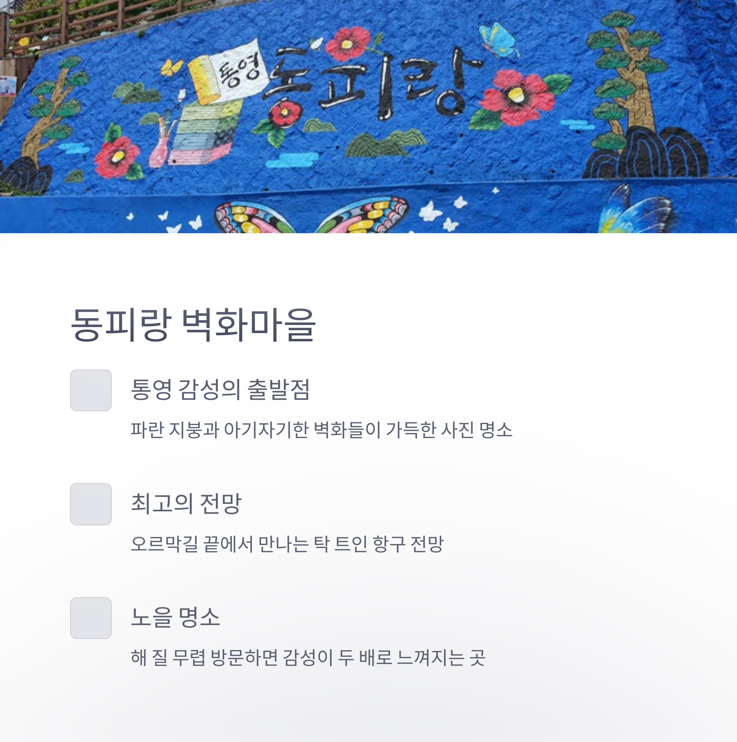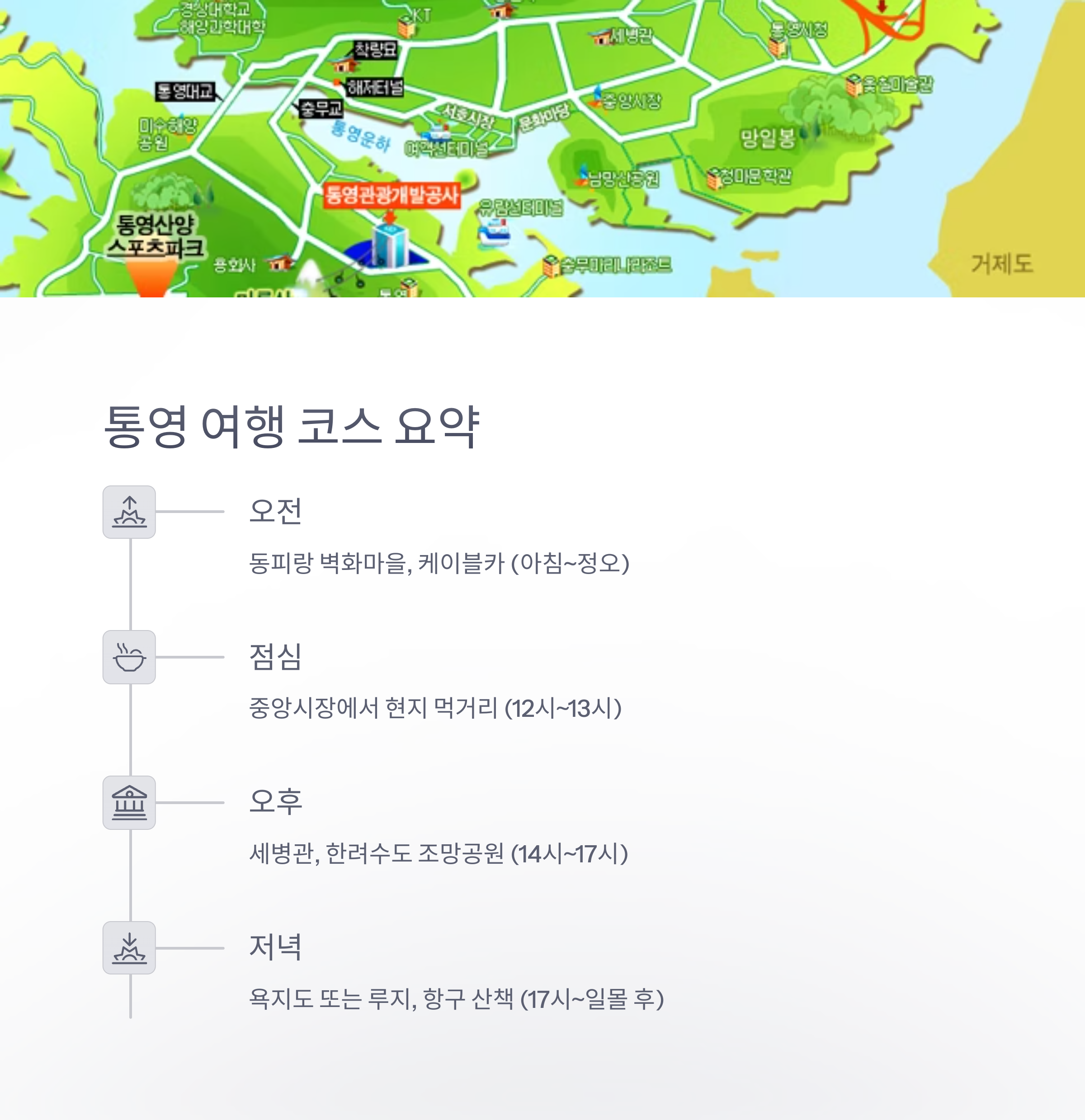 | 오전 | 동피랑, 케이블카 | 아침~정오 |