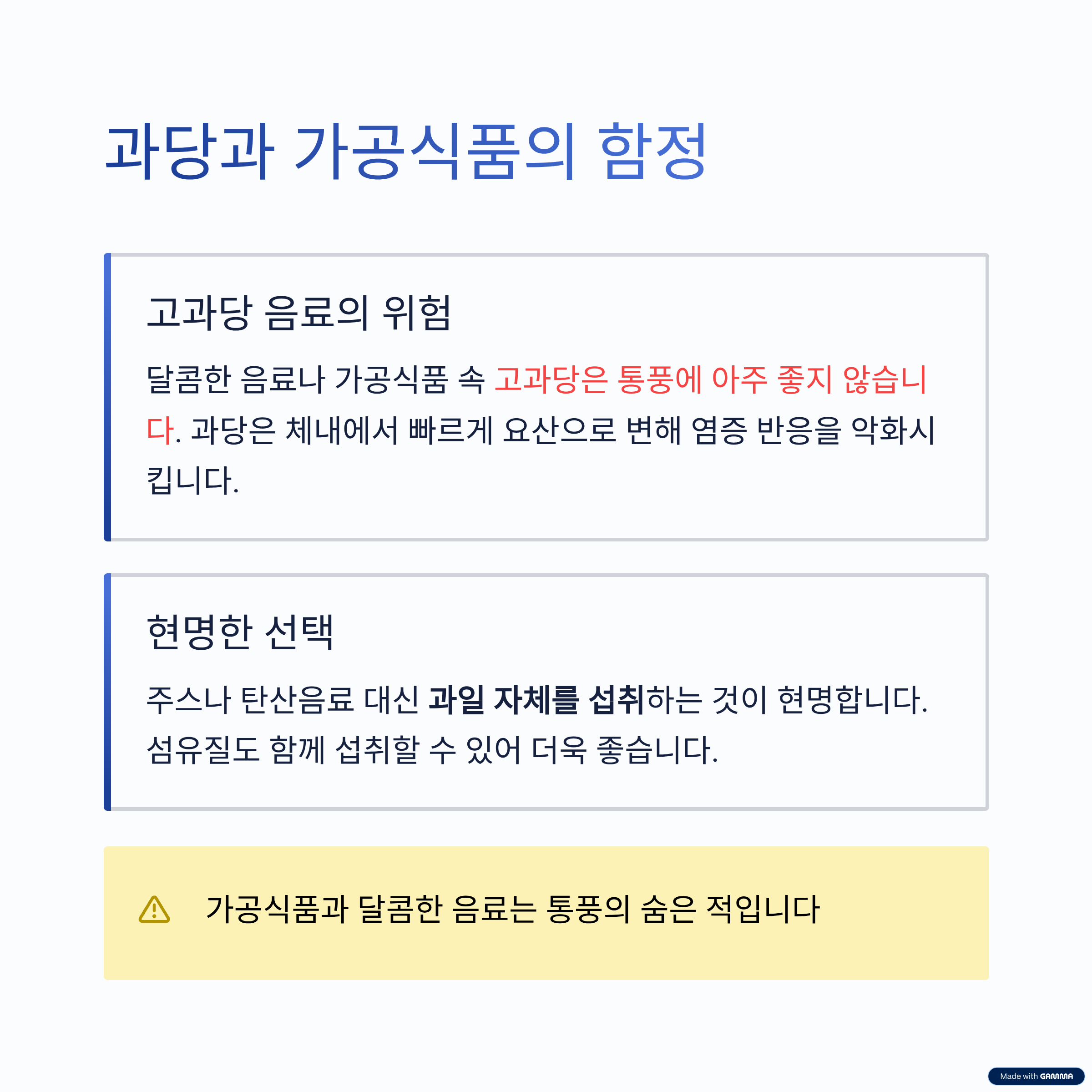 달콤한 음료나 가공식품 속 고과당은 통풍에 아주 좋지 않습니다. 과당은 체내에서 빠르게 요산으로 변해 염증 반응을 악화시키므로 주스나 탄산음료 대신 과일 자체를 섭취하는 것이 현명합니다.