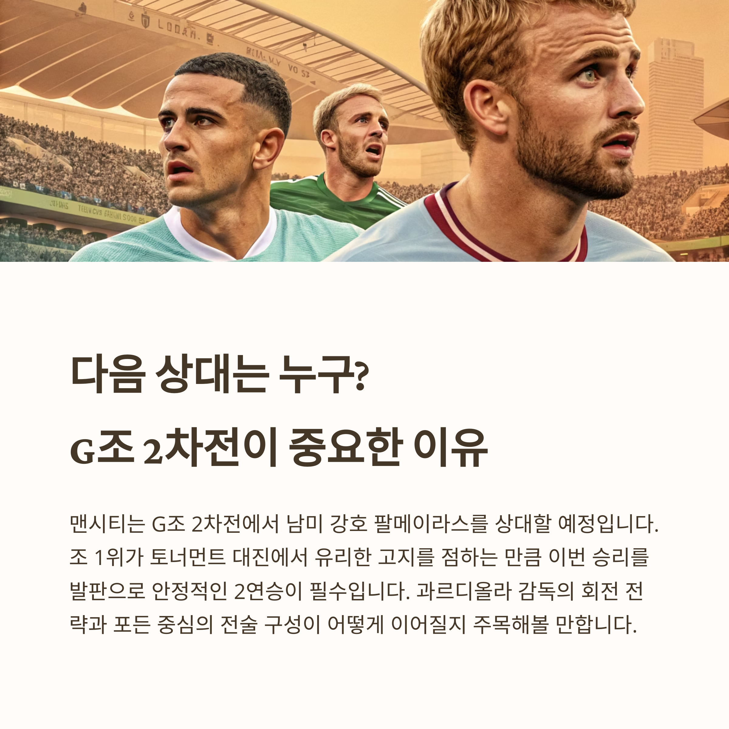 맨시티는 G조 2차전에서 남미 강호 팔메이라스를 상대할 예정입니다.
