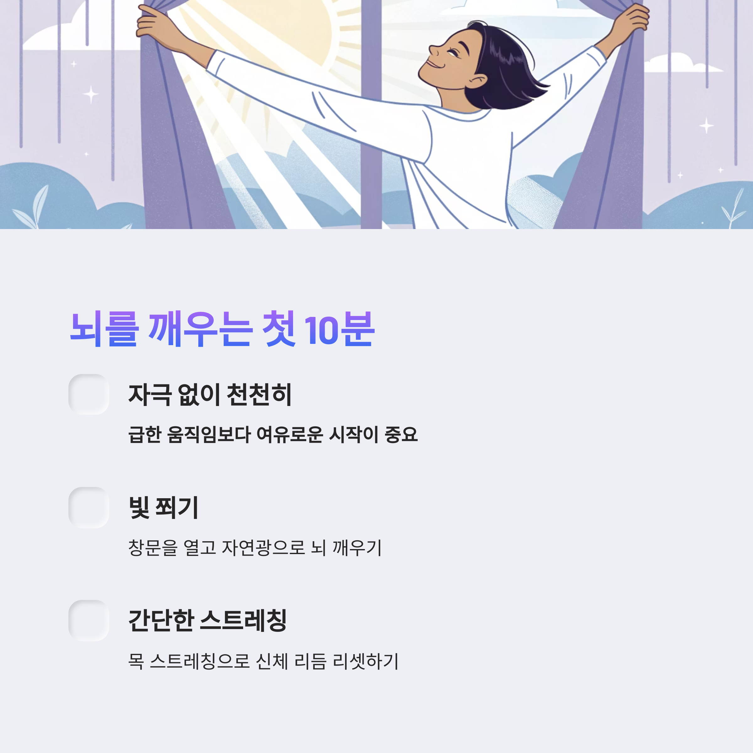 기상 후 가장 먼저 해야 할 일은 자극 없이 몸을 천천히 깨우는 것입니다.