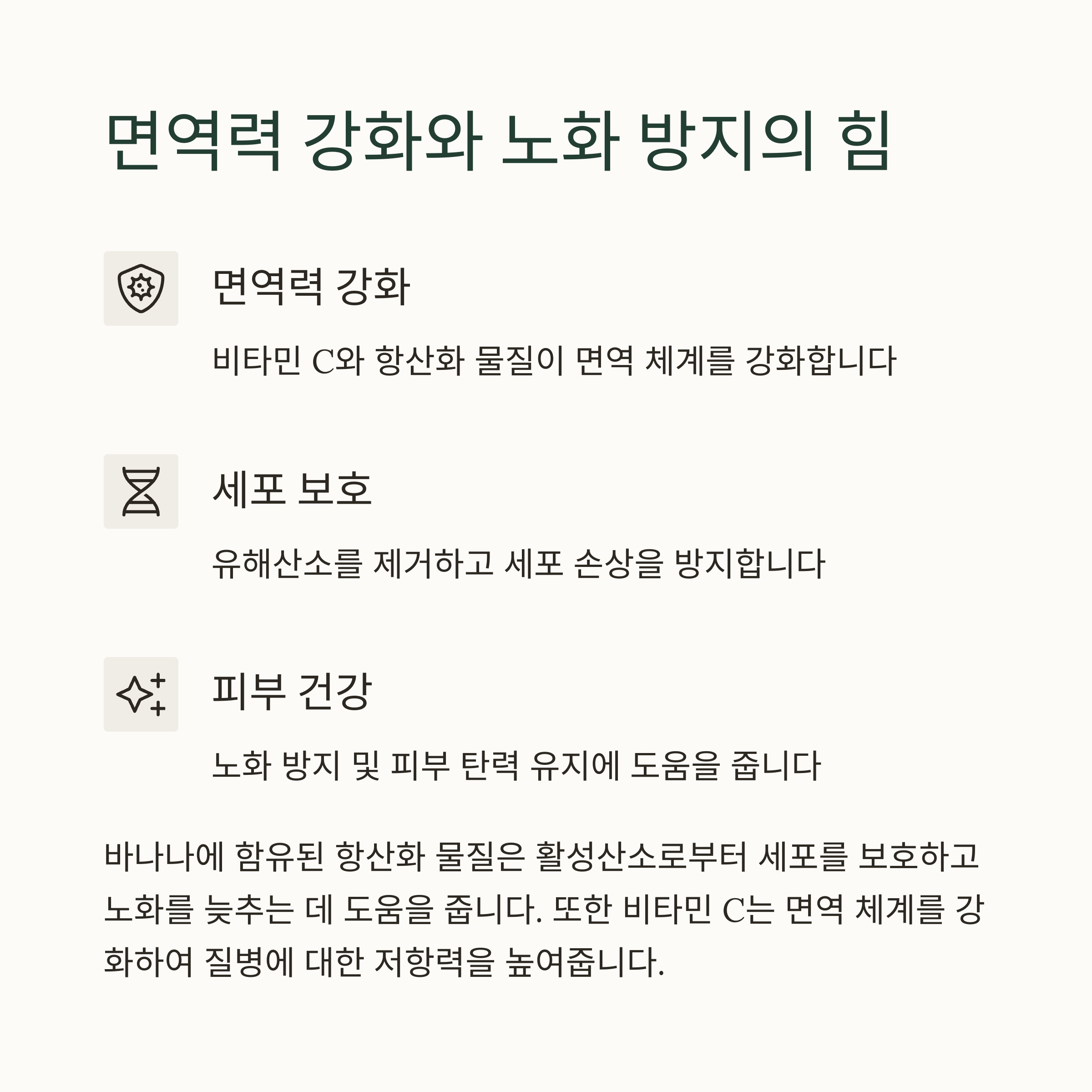 바나나에 포함된 항산화 물질과 비타민 C는 면역력을 높이고 세포 노화를 방지하는 데 효과적입니다.