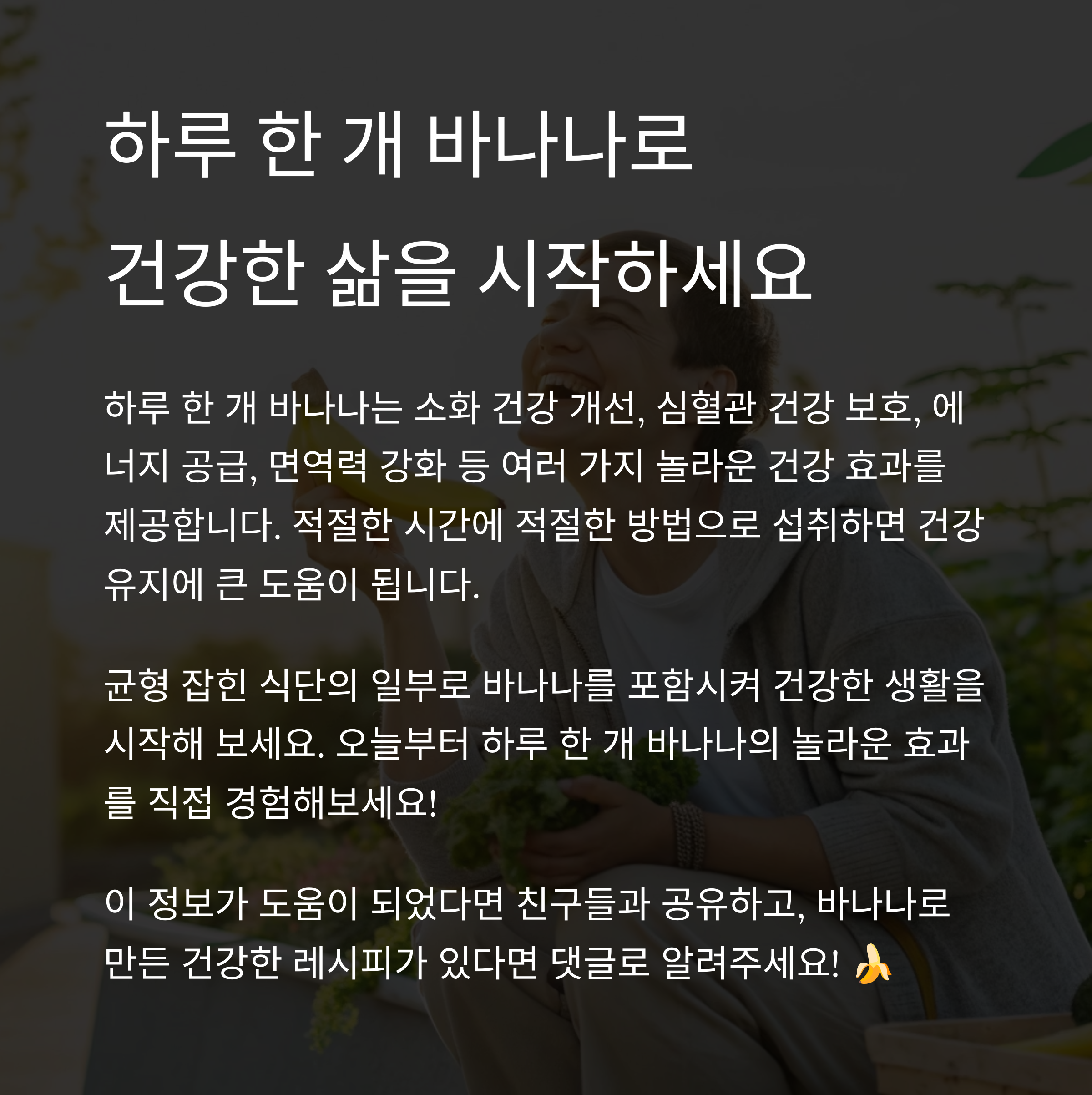 하루 한 개 바나나는 건강에 다양한 긍정적인 영향을 미칠 수 있습니다. 소화 건강 개선, 심혈관 건강 보호, 에너지 공급, 면역력 강화 등 여러 가지 장점이 있는 만큼, 적절하게 섭취하면 건강 유지에 도움이 됩니다. 하지만 과다 섭취는 피하고, 균형 잡힌 식단과 함께 섭취하는 것이 중요합니다. 오늘부터 하루 한 개 바나나를 섭취하며 건강한 생활을 시작해 보세요!