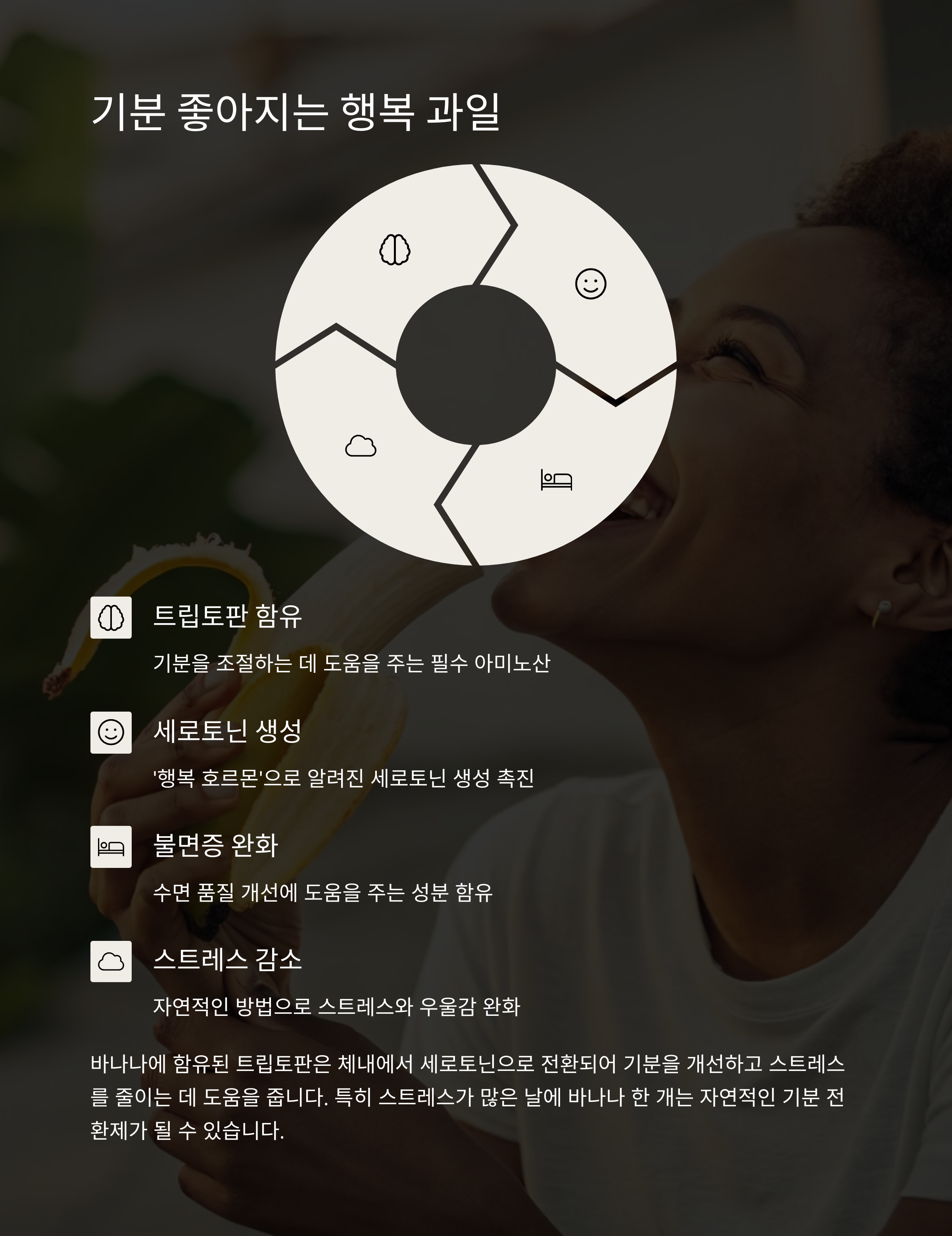 바나나는 기분을 조절하는 데 도움을 주는 트립토판(tryptophan) 성분을 함유하고 있습니다.