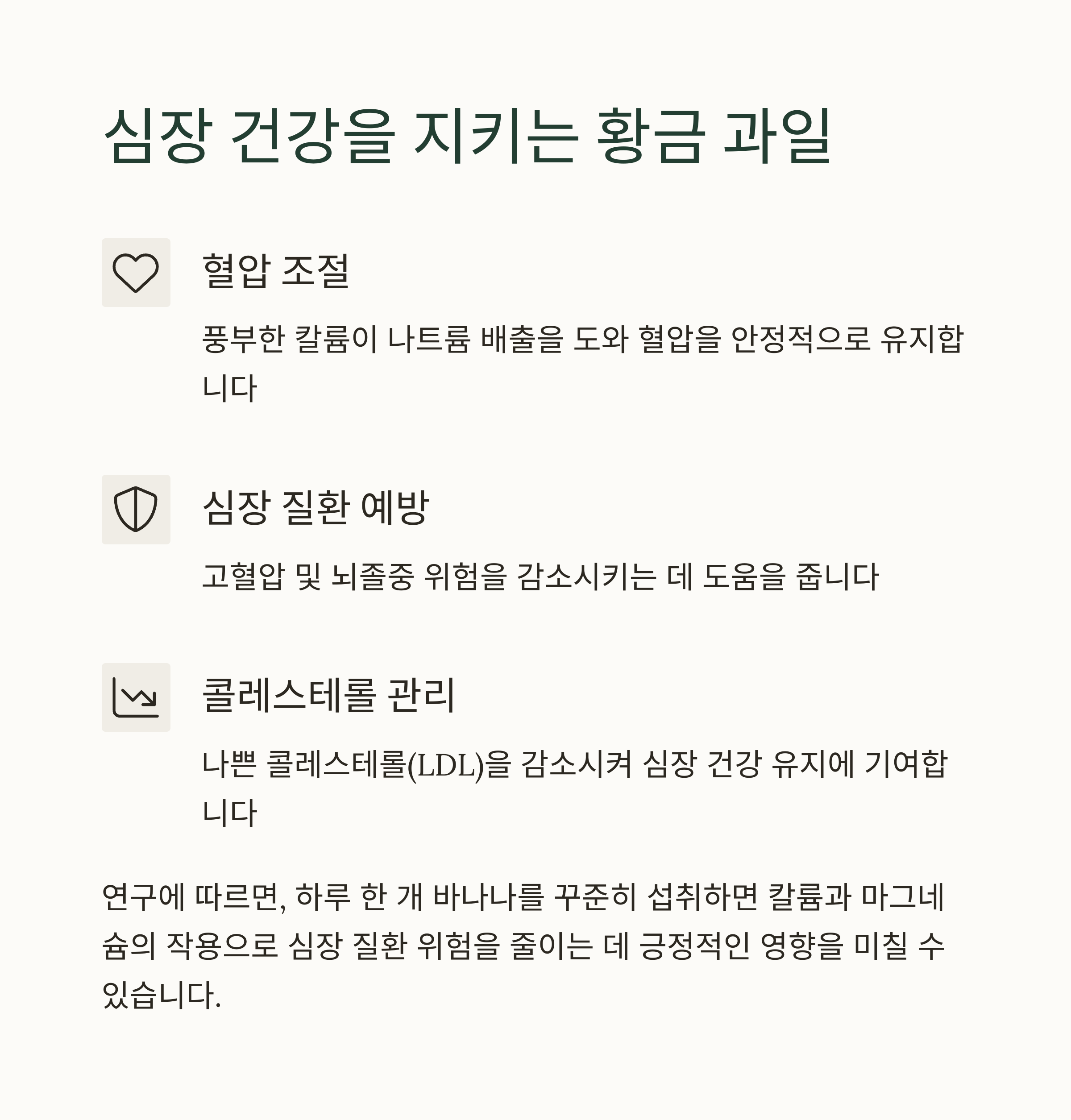 연구에 따르면, 하루 한 개 바나나를 꾸준히 섭취하면 심장 질환 위험을 줄이는 데 긍정적인 영향을 미칠 수 있습니다.
