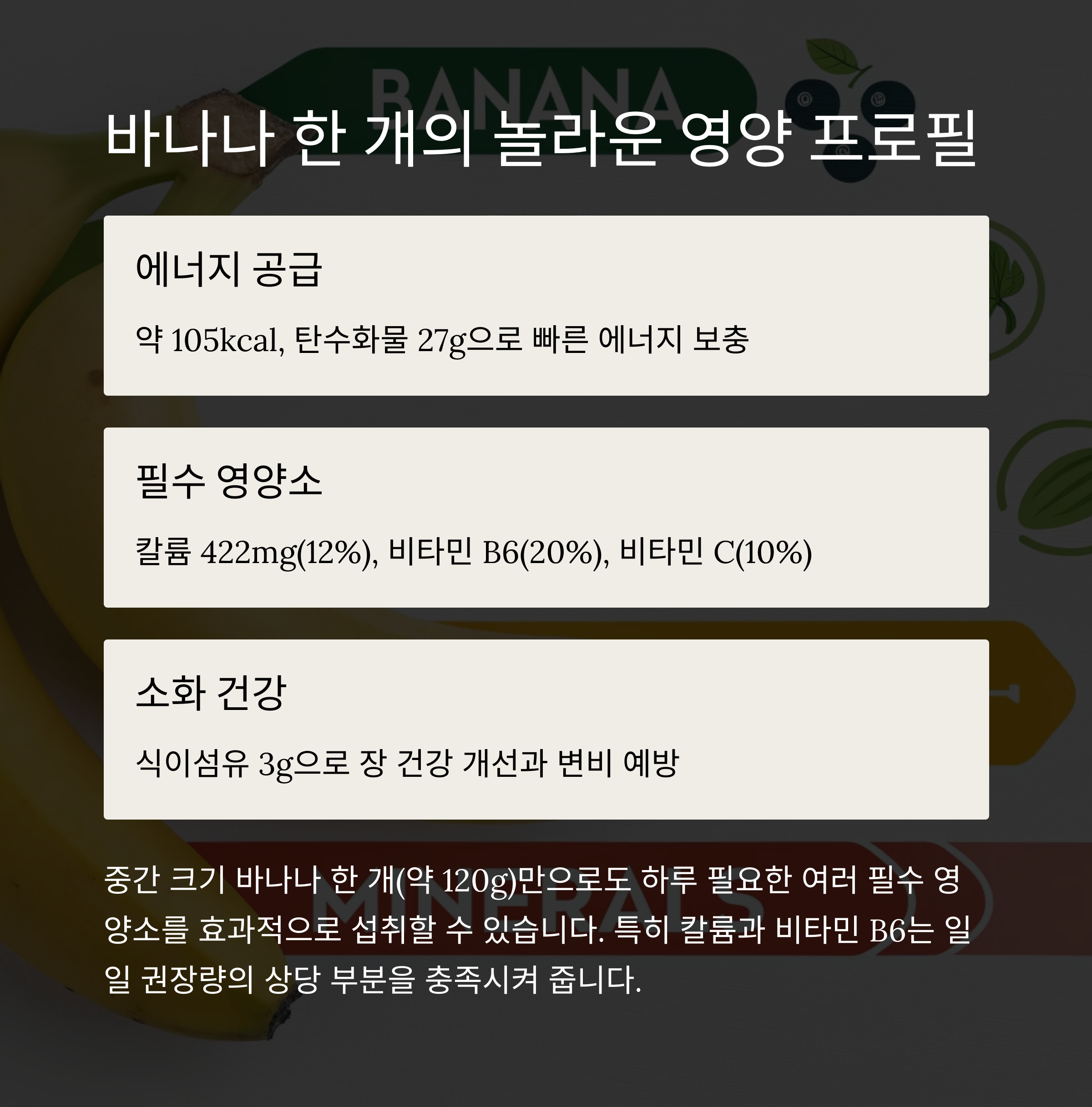 바나나는 필수 영양소가 풍부한 과일로, 하루 한 개만 섭취해도 다양한 영양소를 공급받을 수 있습니다.
