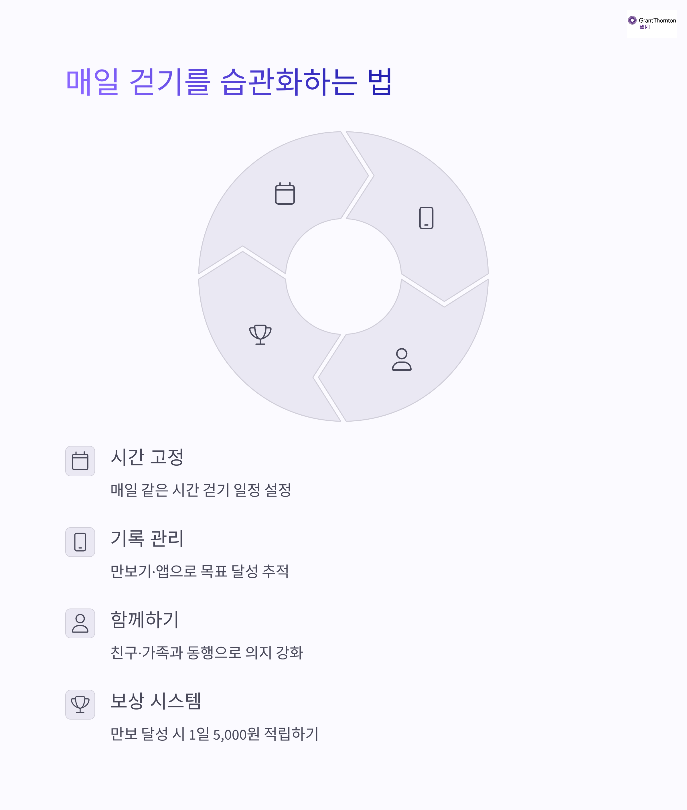 걷기 습관화의 핵심은 "정해진 시간에 알람 설정 + 날씨 상관없는 장소 확보"입니다.