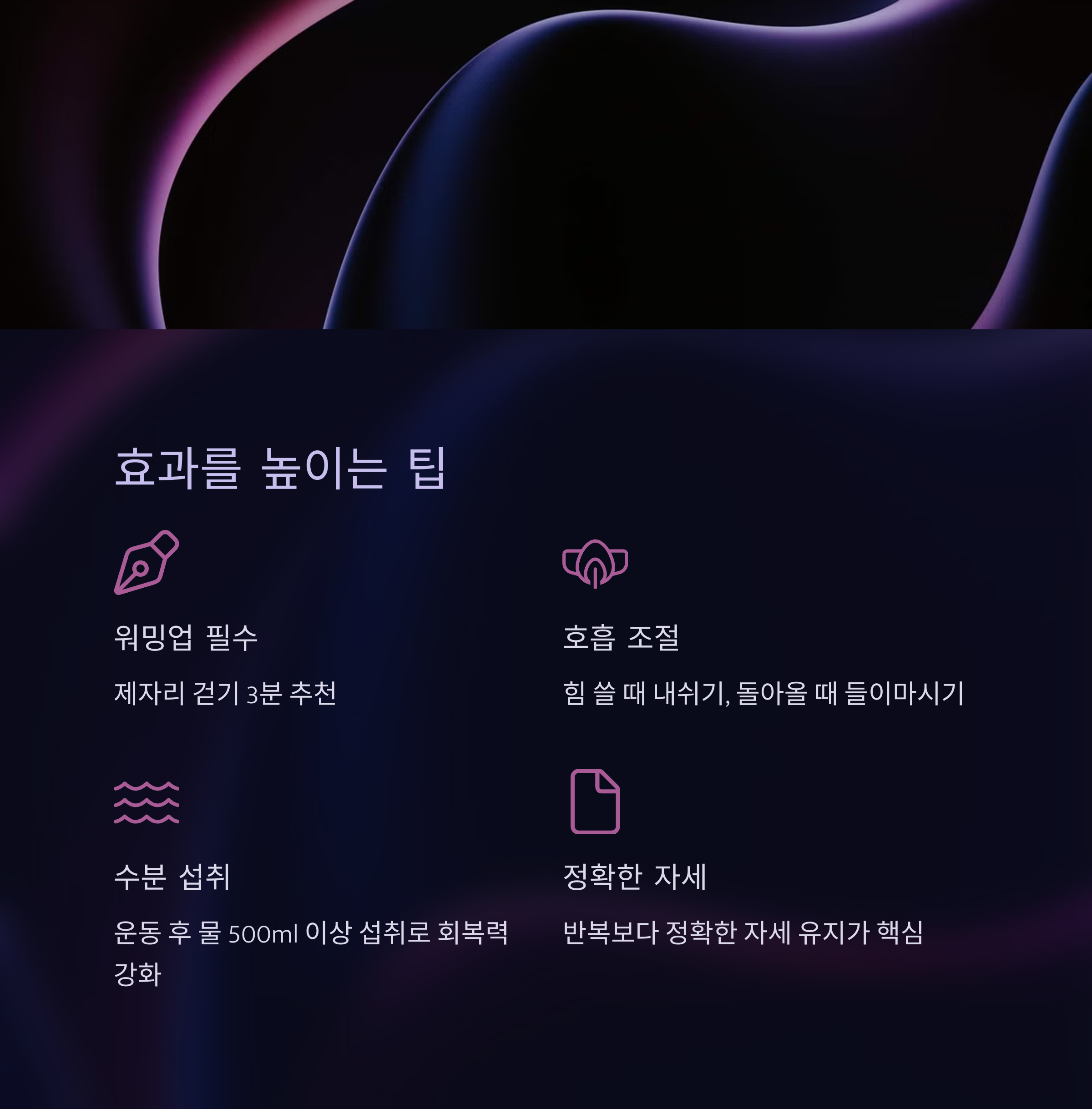 - 운동 후 물 500ml 이상 섭취로 회복력 강화