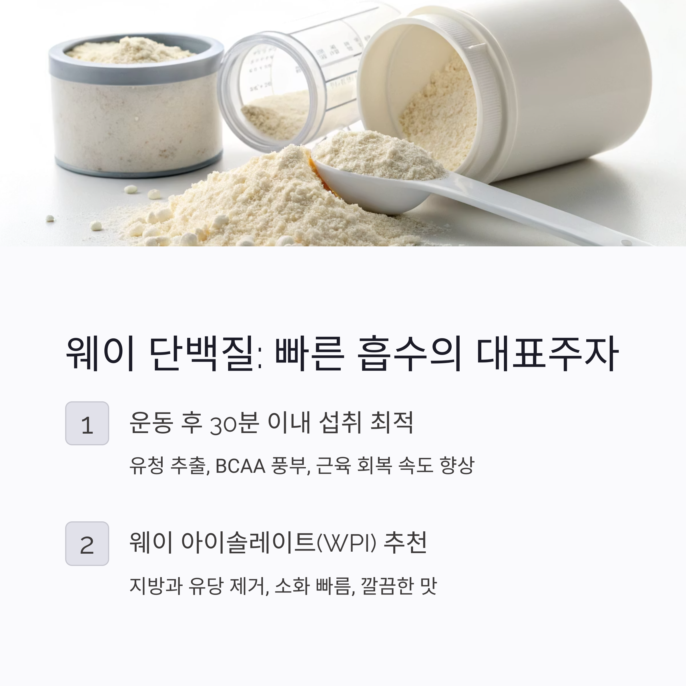 유청에서 추출되며 BCAA가 풍부해 근육 회복 속도를 높이는 데 효과적입니다.