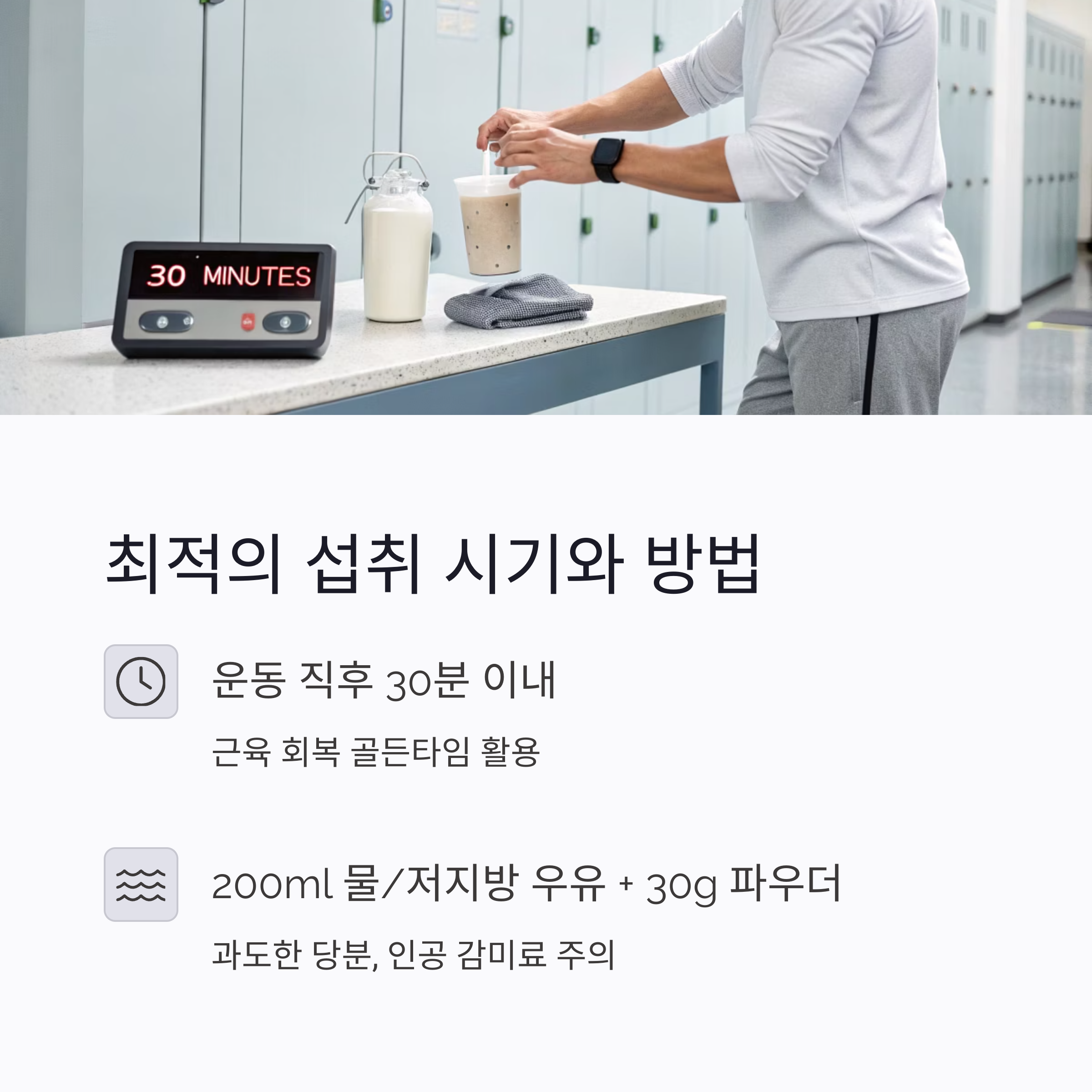 운동 직후 30분 이내, 200ml 정도의 물이나 저지방 우유에 30g 내외의 단백질 파우더를 섞어 섭취하는 것이 이상적입니다.