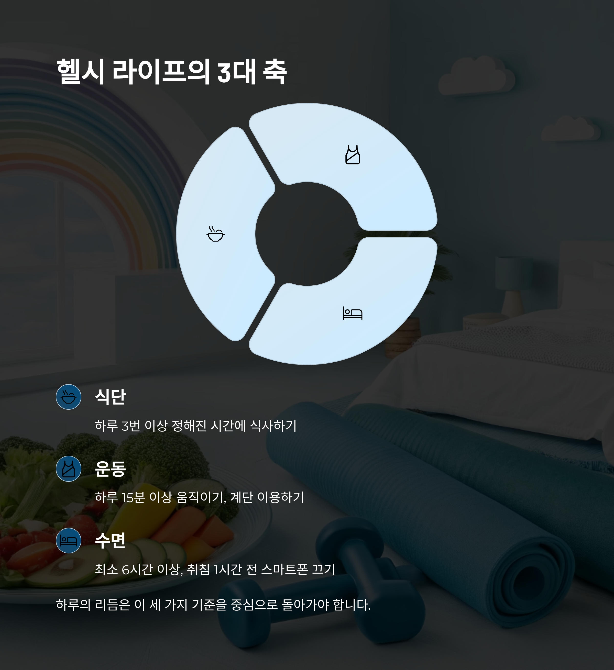 헬시 라이프의 3대 축은 '식단, 활동, 수면'입니다.