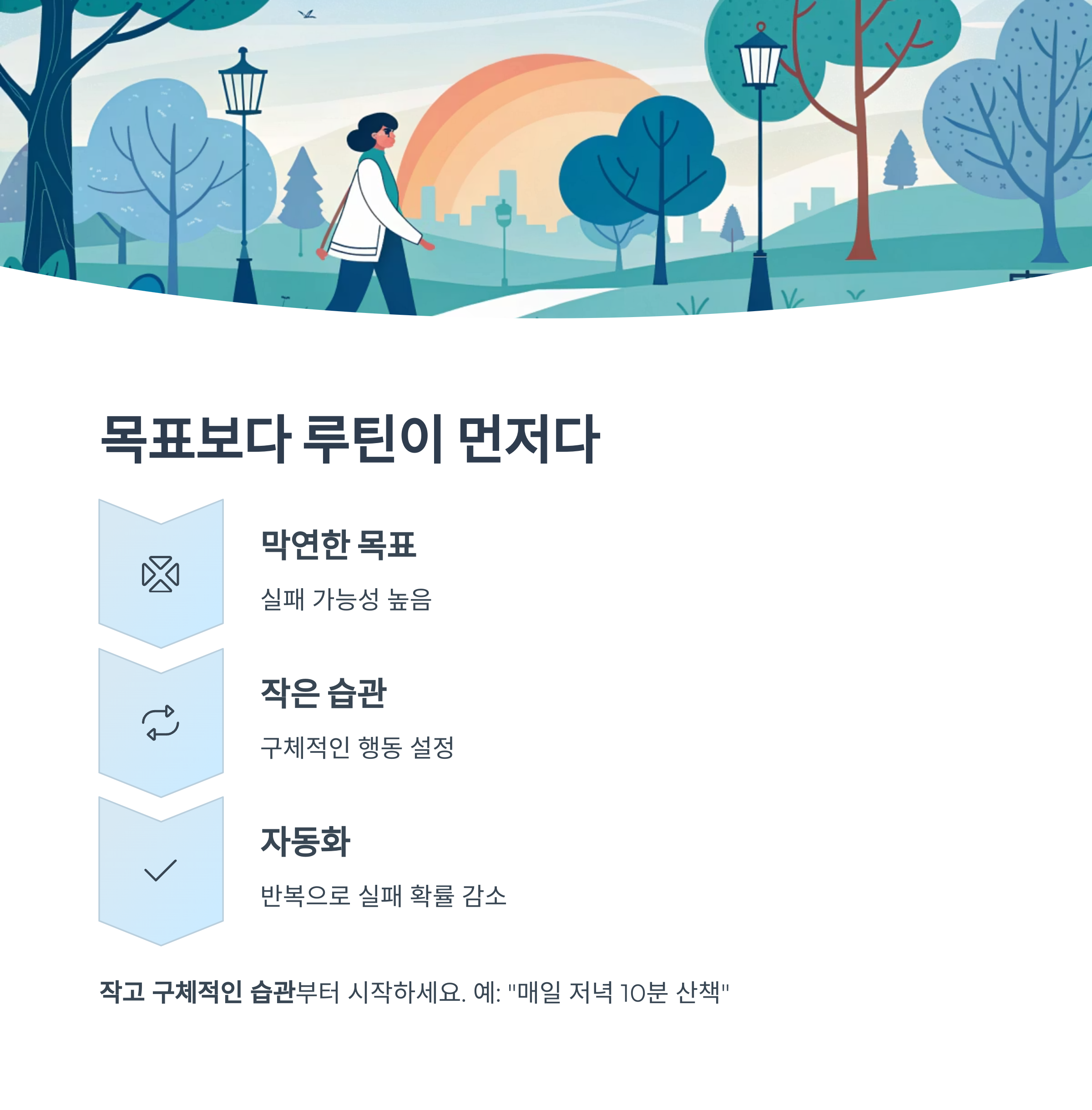 “매일 저녁 10분 산책”처럼 작고 구체적인 습관부터 설정하세요.