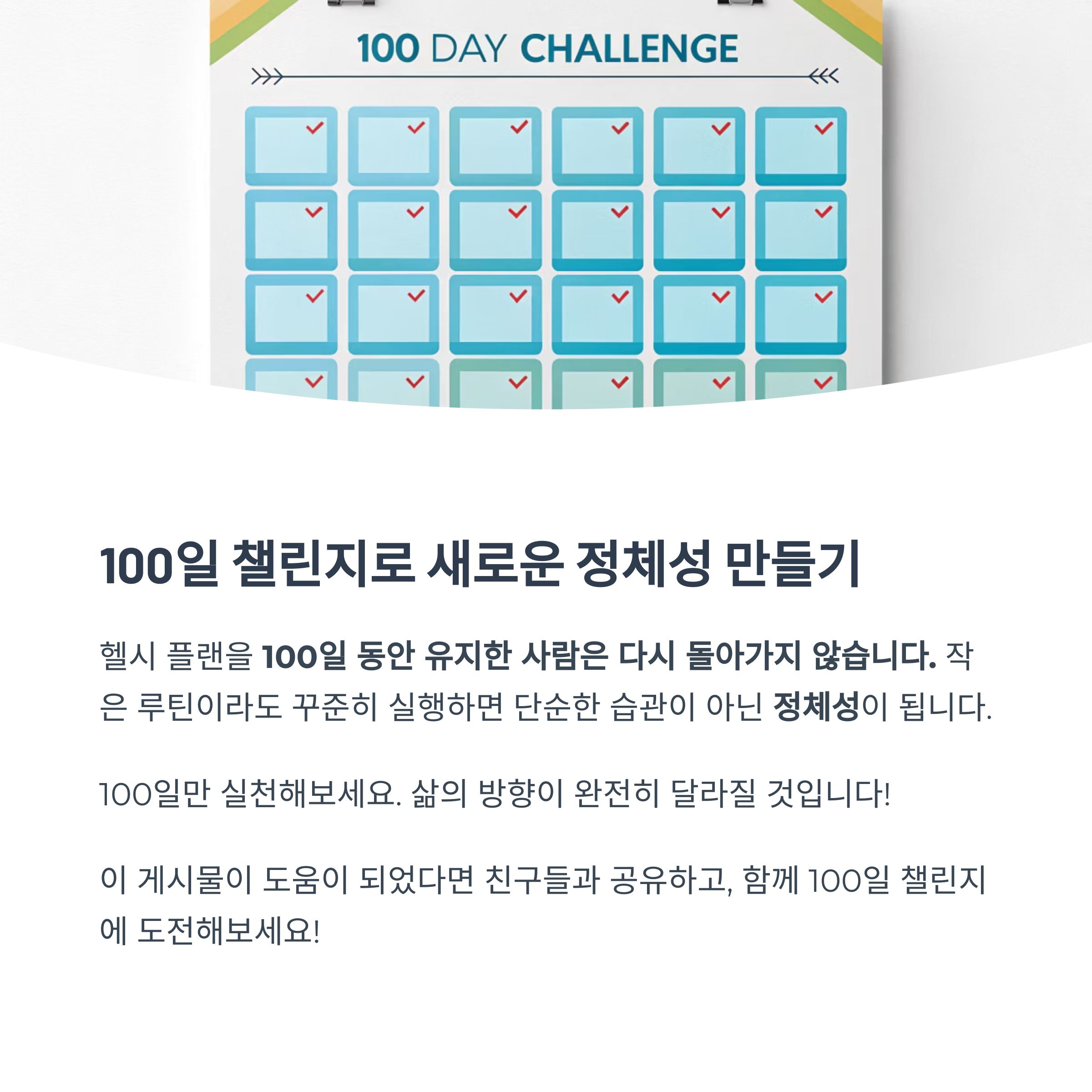 100일만 실천해보면 삶의 방향이 완전히 달라진다는 것을 느낄 수 있습니다.