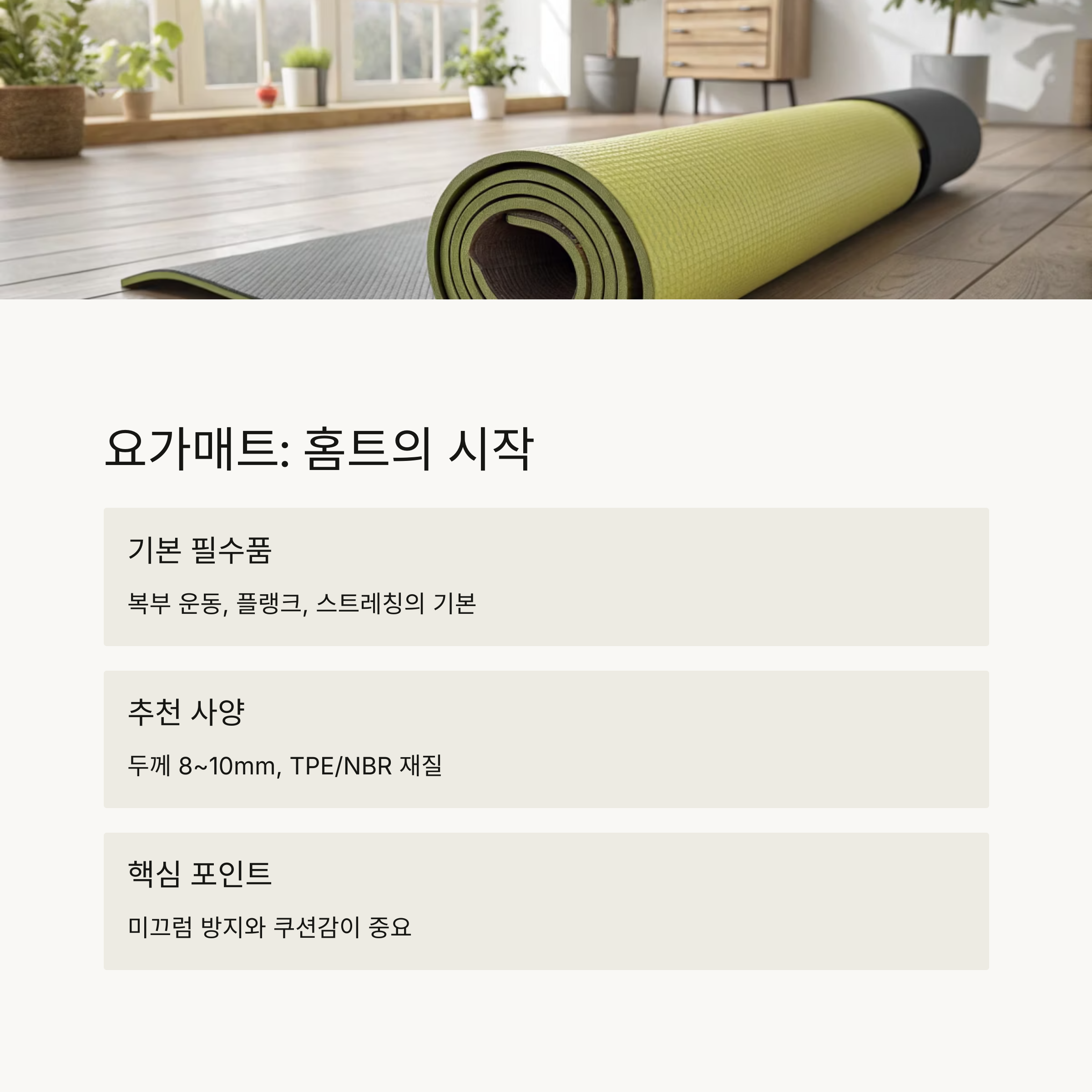 핵심: 미끄러지지 않고 쿠션감 있는 매트를 고르는 것이 가장 중요합니다.