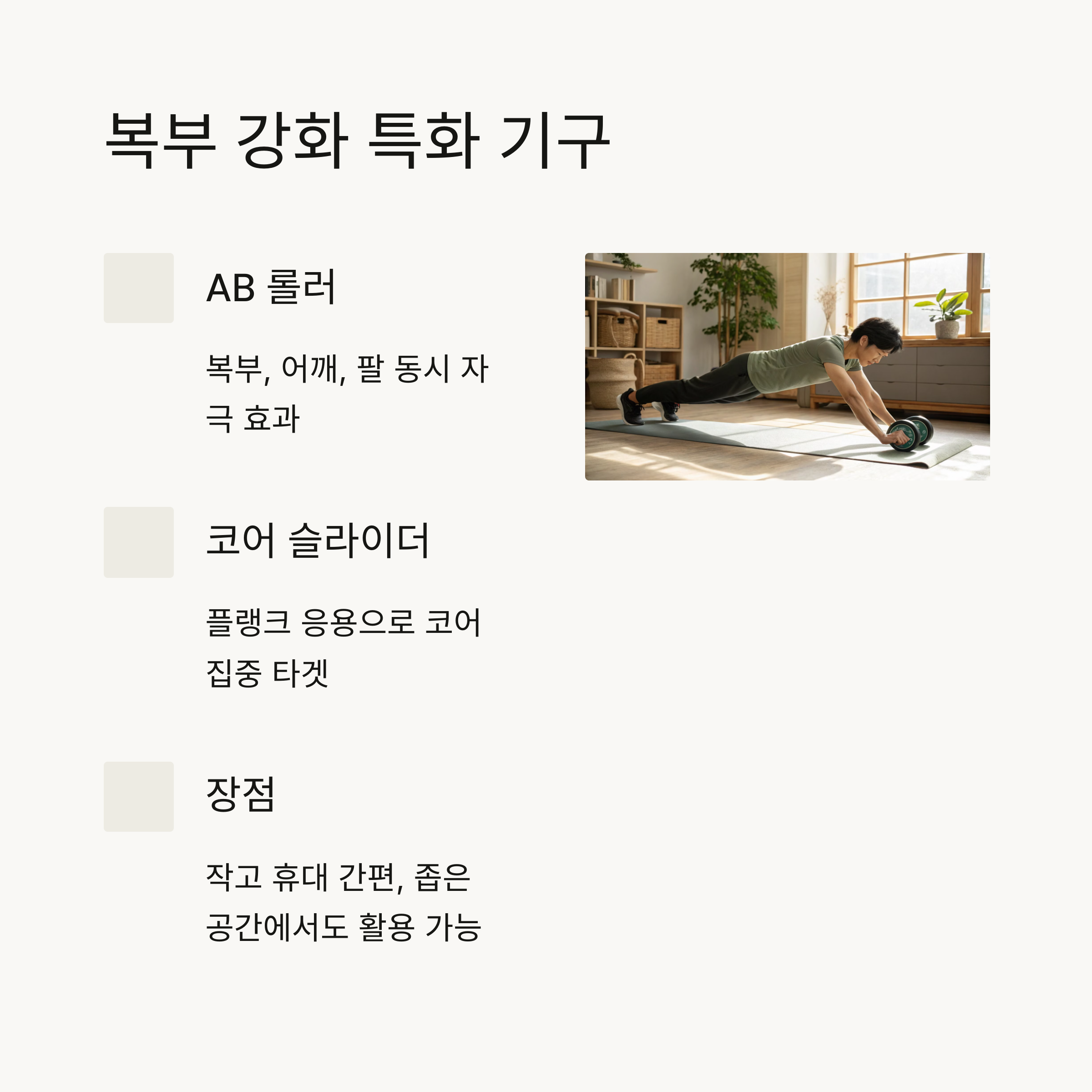 | AB 롤러 | 복부 + 어깨, 팔 동시에 자극 |