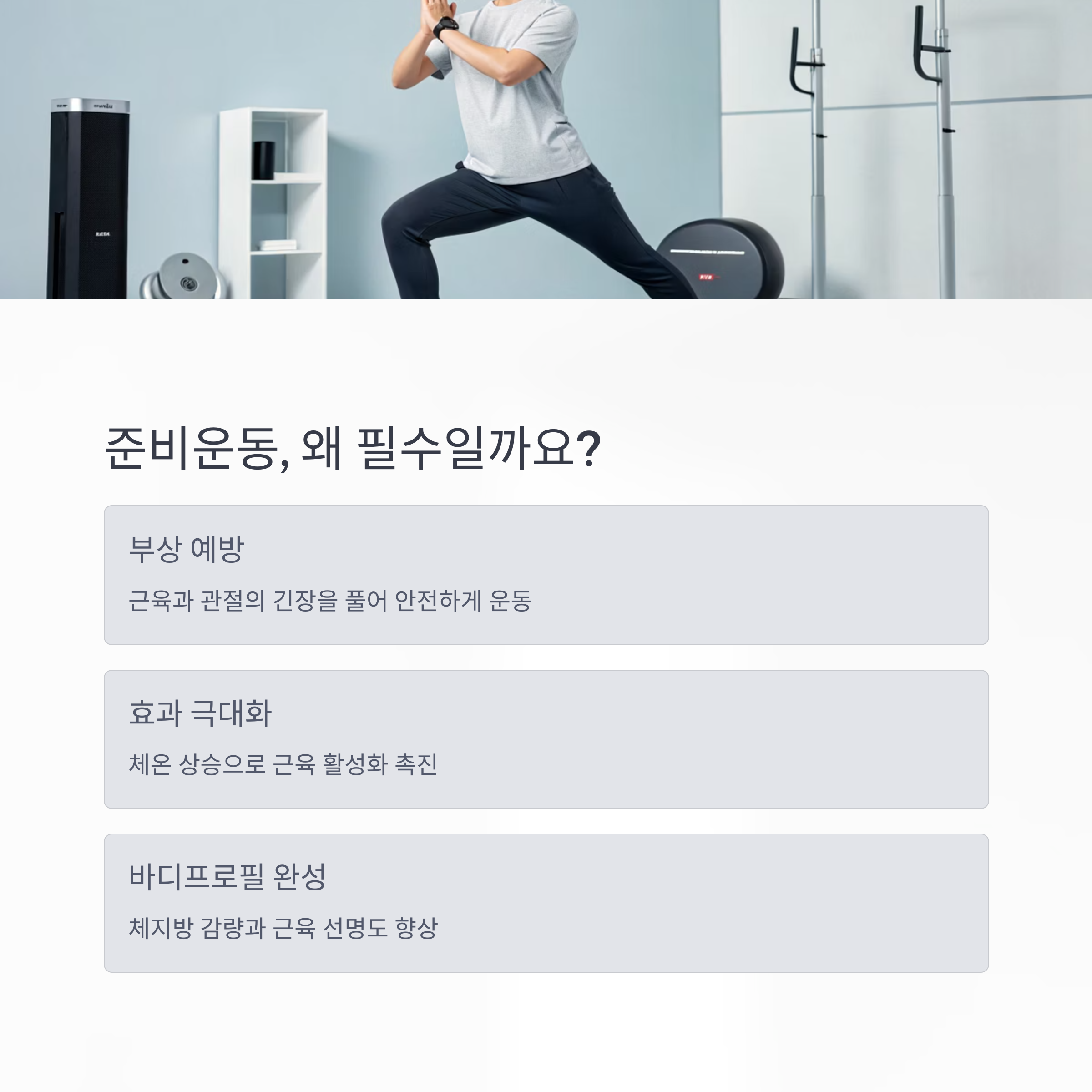 정리하자면, 준비운동은 근육을 깨우는 ‘시동’이자, 부상을 막는 ‘안전벨트’입니다.