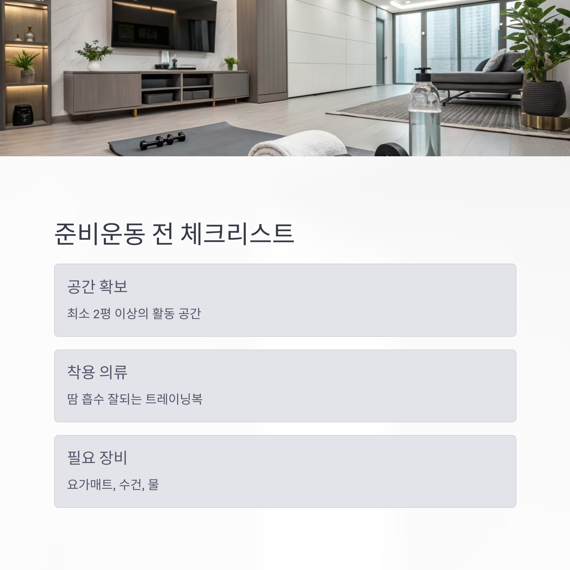 | 장비 | 요가매트, 수건, 가벼운 덤벨(선택 사항) |