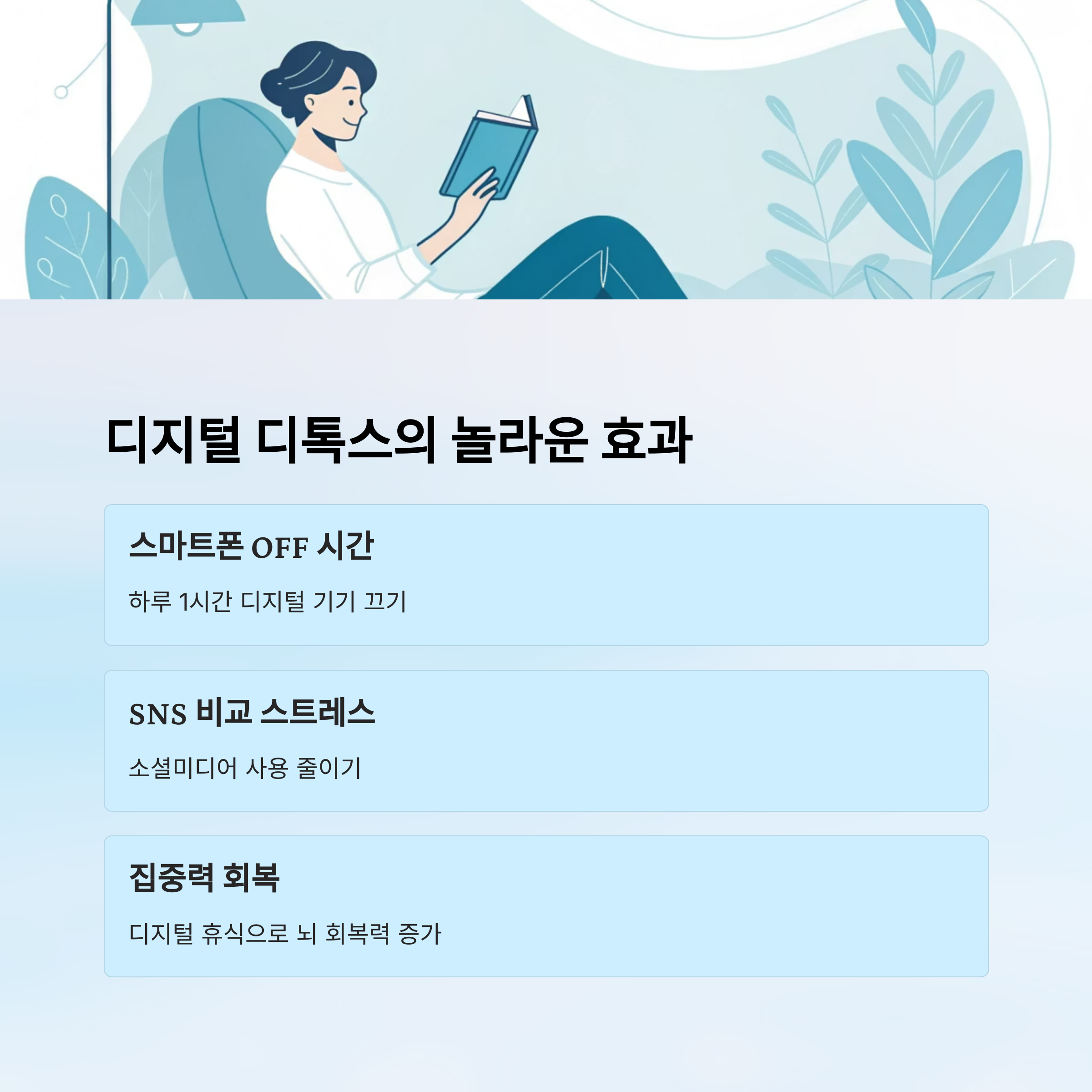 그 시간 동안 산책, 독서, 혹은 명상 등으로 대체하면 뇌가 휴식하며 회복됩니다.