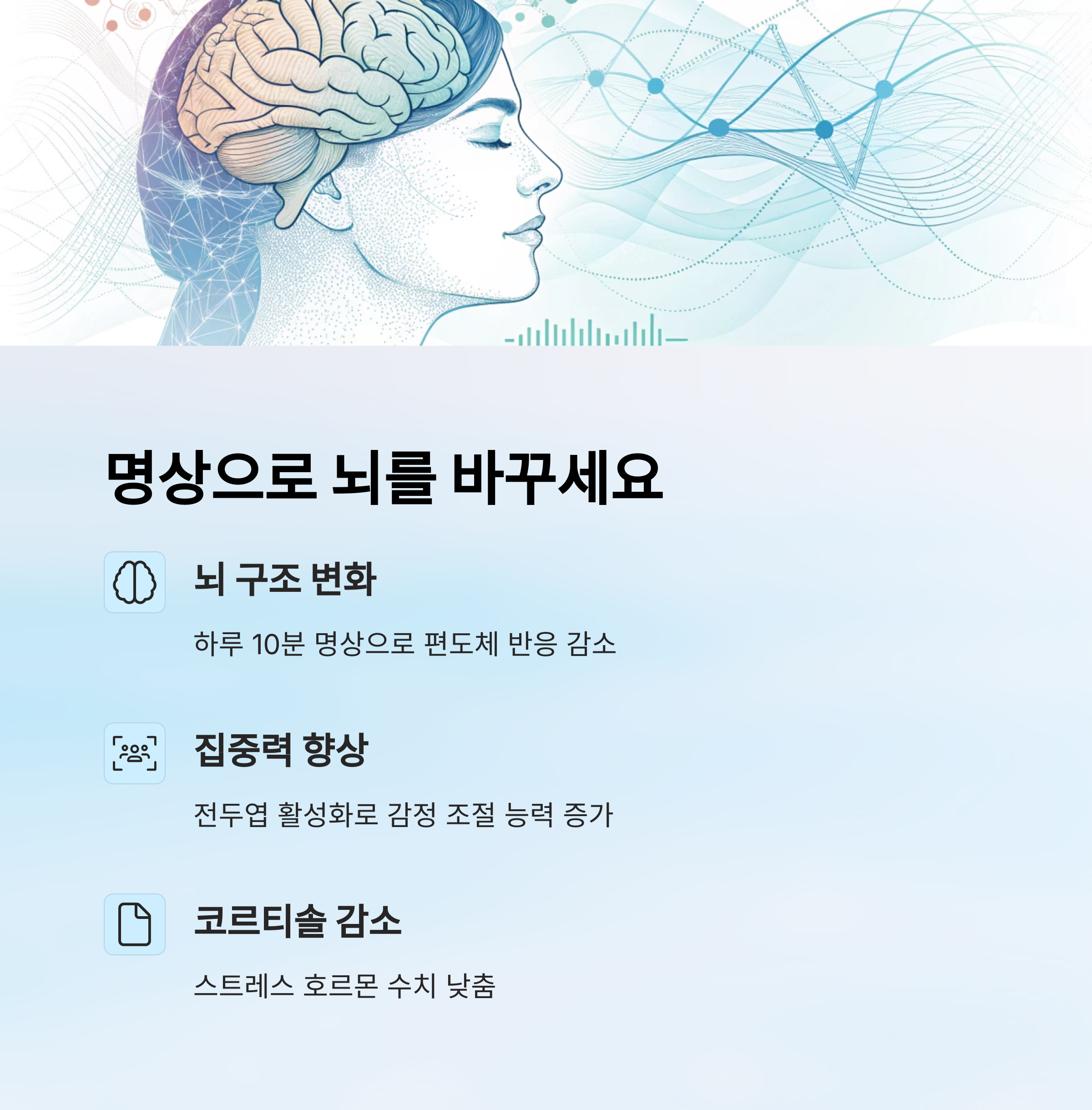 하버드대 연구에 따르면, 하루 10분 명상만으로도 편도체의 반응을 감소시켜 스트레스에 덜 민감해진다고 합니다.