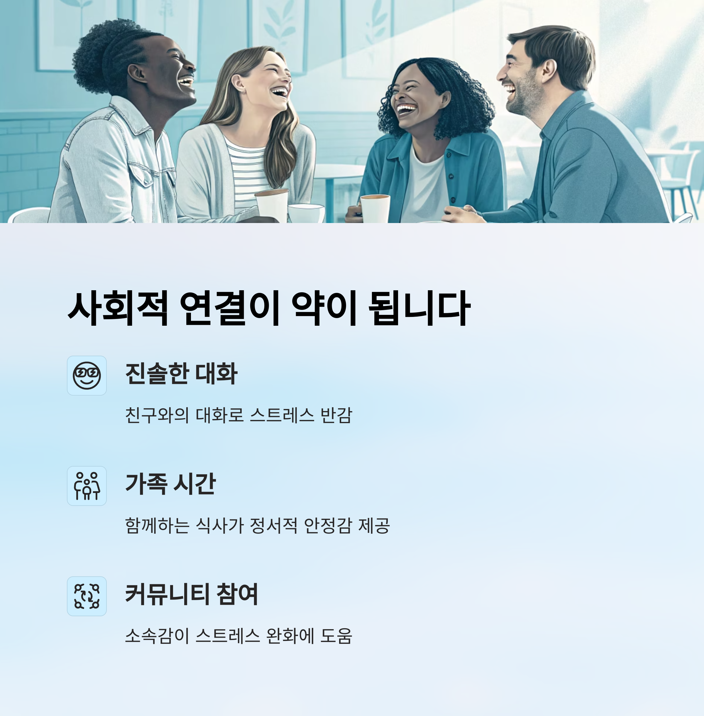 5. 사회적 연결 – 따뜻한 대화가 약이 됩니다
