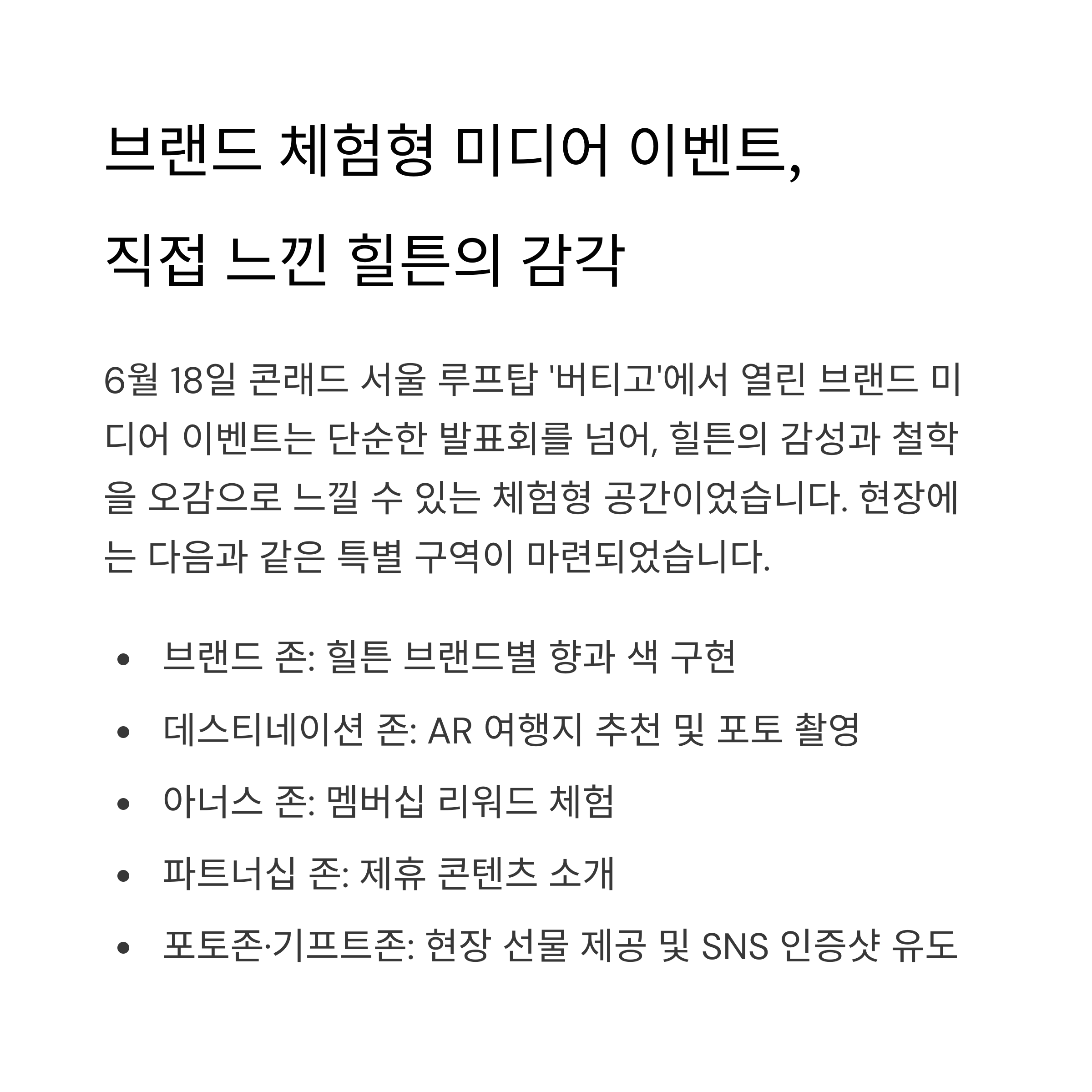 힐튼의 감성과 철학을 오감으로 느낄 수 있는 체험형 공간이었습니다.