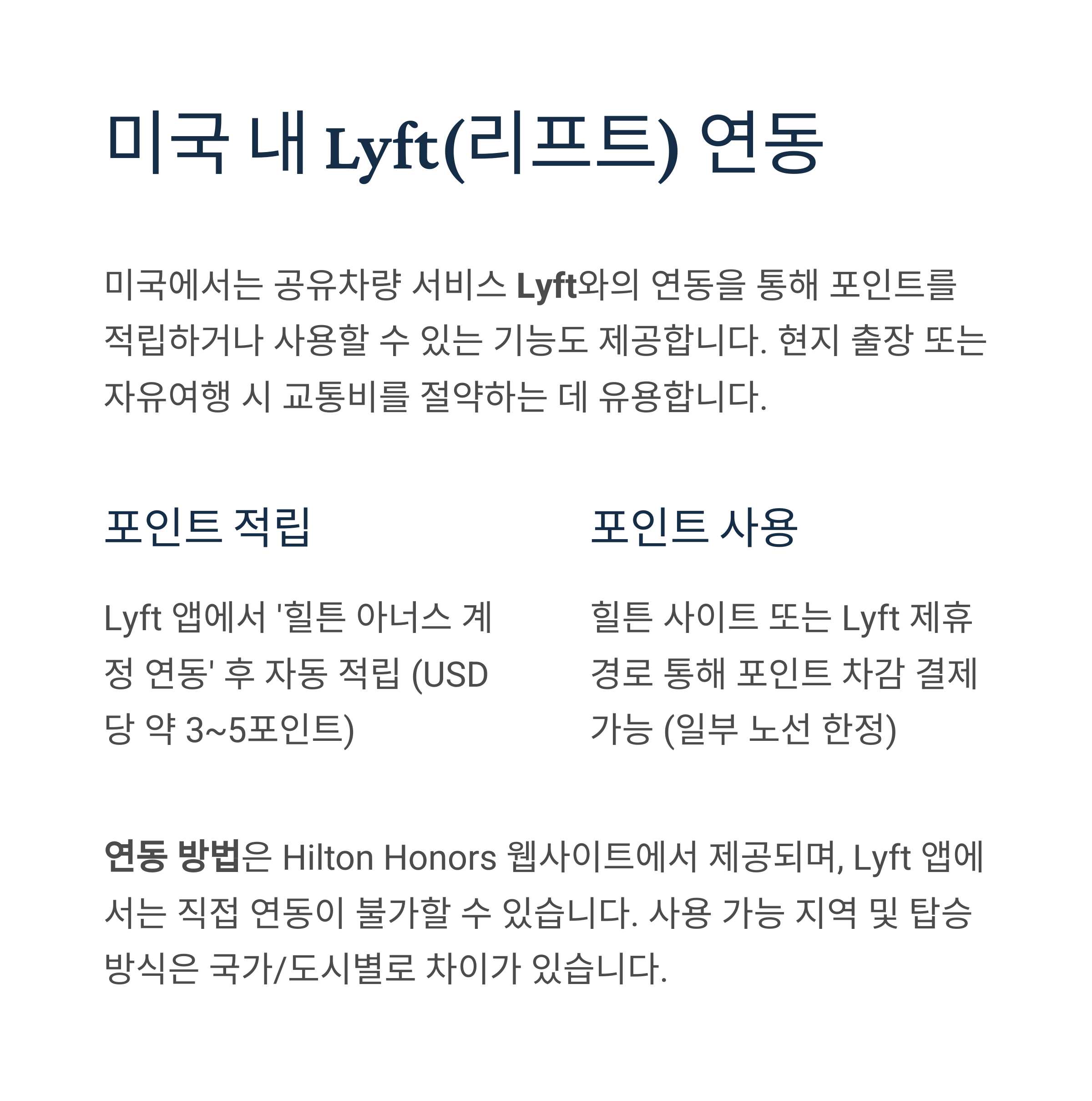 | 포인트 사용 | 힐튼 사이트 또는 Lyft 제휴 경로 통해 포인트 차감 결제 가능 (일부 노선 한정) |