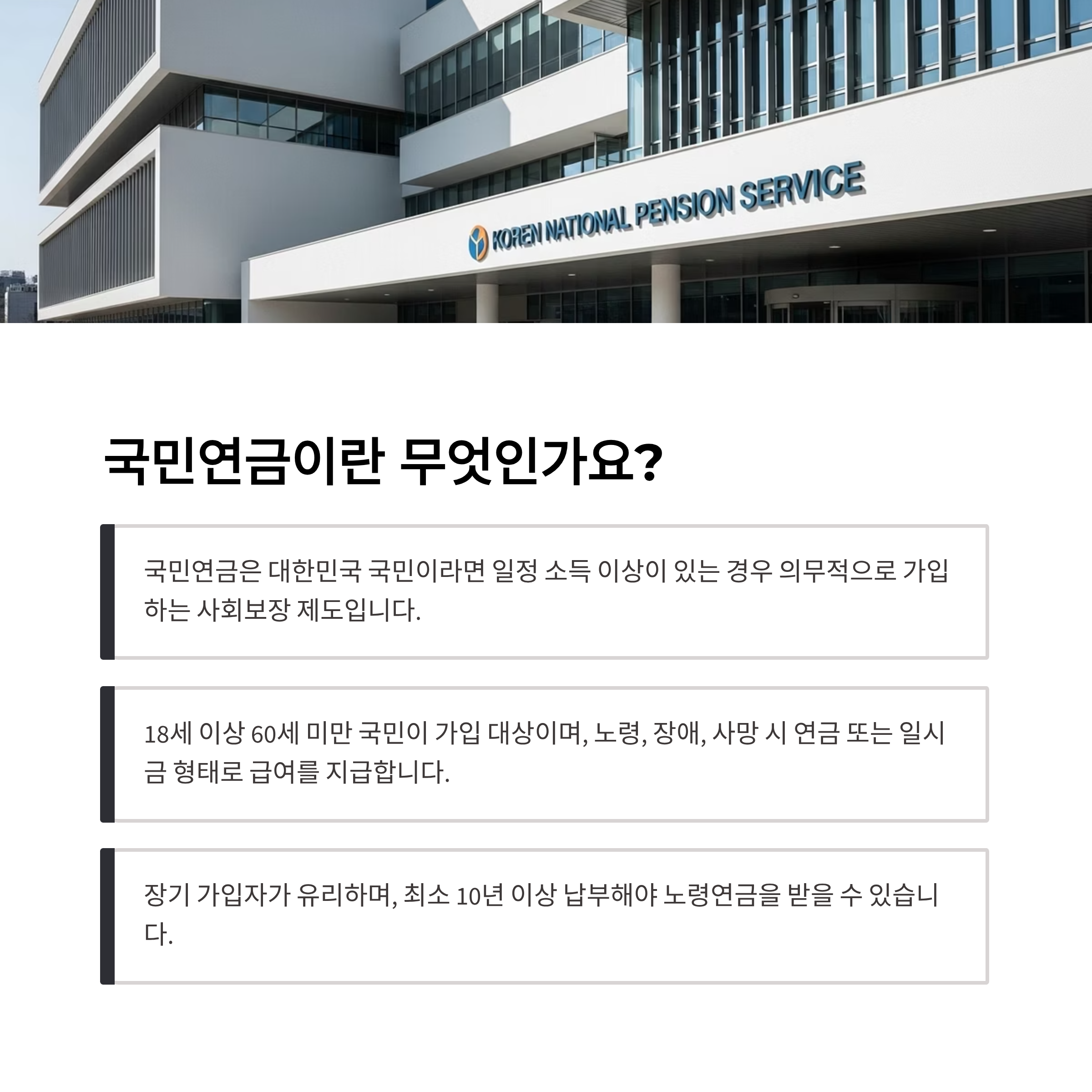 급여를 지급합니다. 장기 가입자가 유리하며, 최소 10년 이상 납부해야