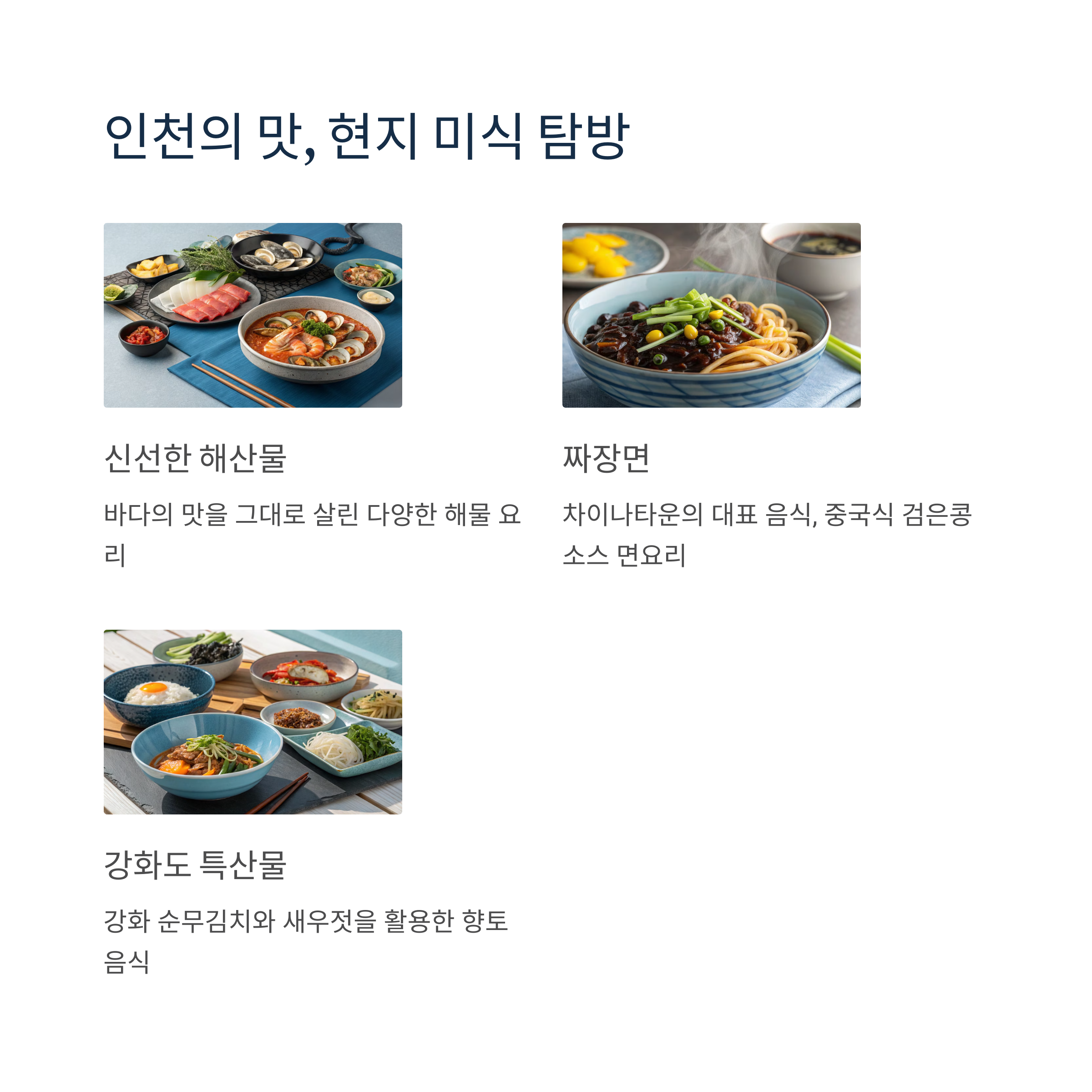 - 기타 맛집: 영종도 구읍뱃터의 신선한 조개구이, 송도 맛집 거리의 트렌디한 음식점들도 추천합니다.