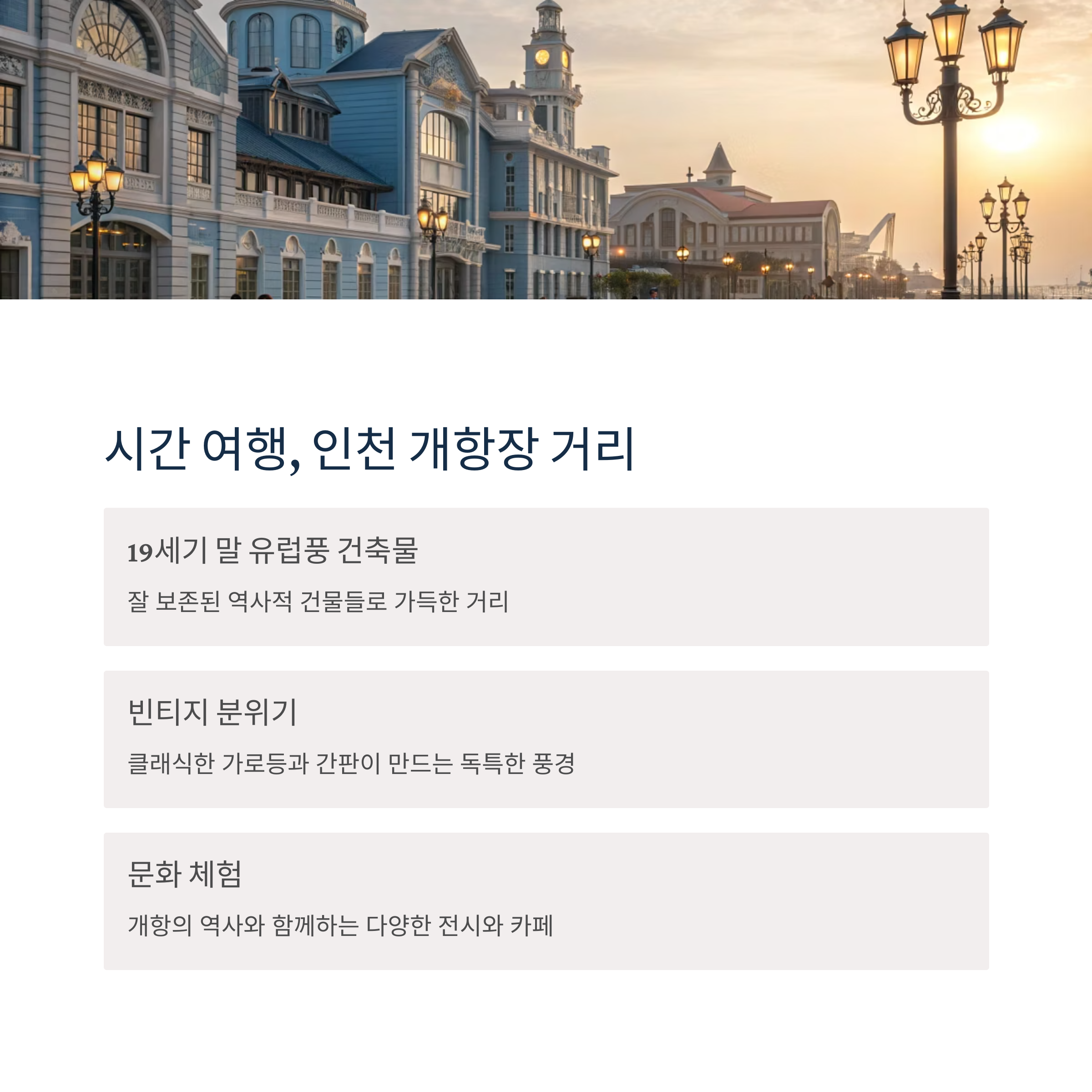 - 시간이 멈춘 듯한 개항장 거리는 과거 인천의 번성했던 모습을 엿볼 수 있는 곳입니다. 고풍스러운 건축물들을 감상하며 거닐다 보면 마치 시간 여행을 하는 듯한 느낌을 받을 수 있습니다. 인천개항박물관, 인천아트플랫폼 등 다양한 문화 공간도 놓치지 마세요! 🏛️🎨
