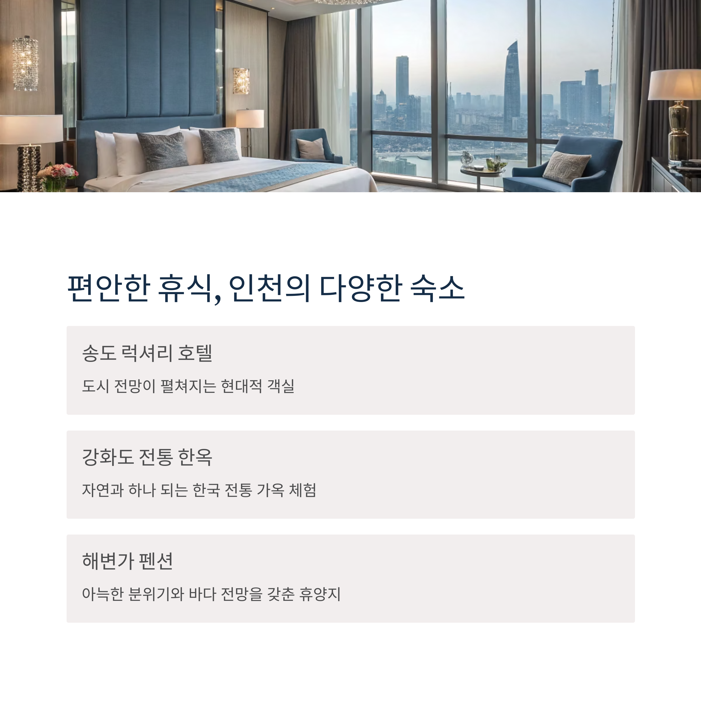 - 럭셔리 & 편리함: 도심형 호텔 (송도, 영종도)