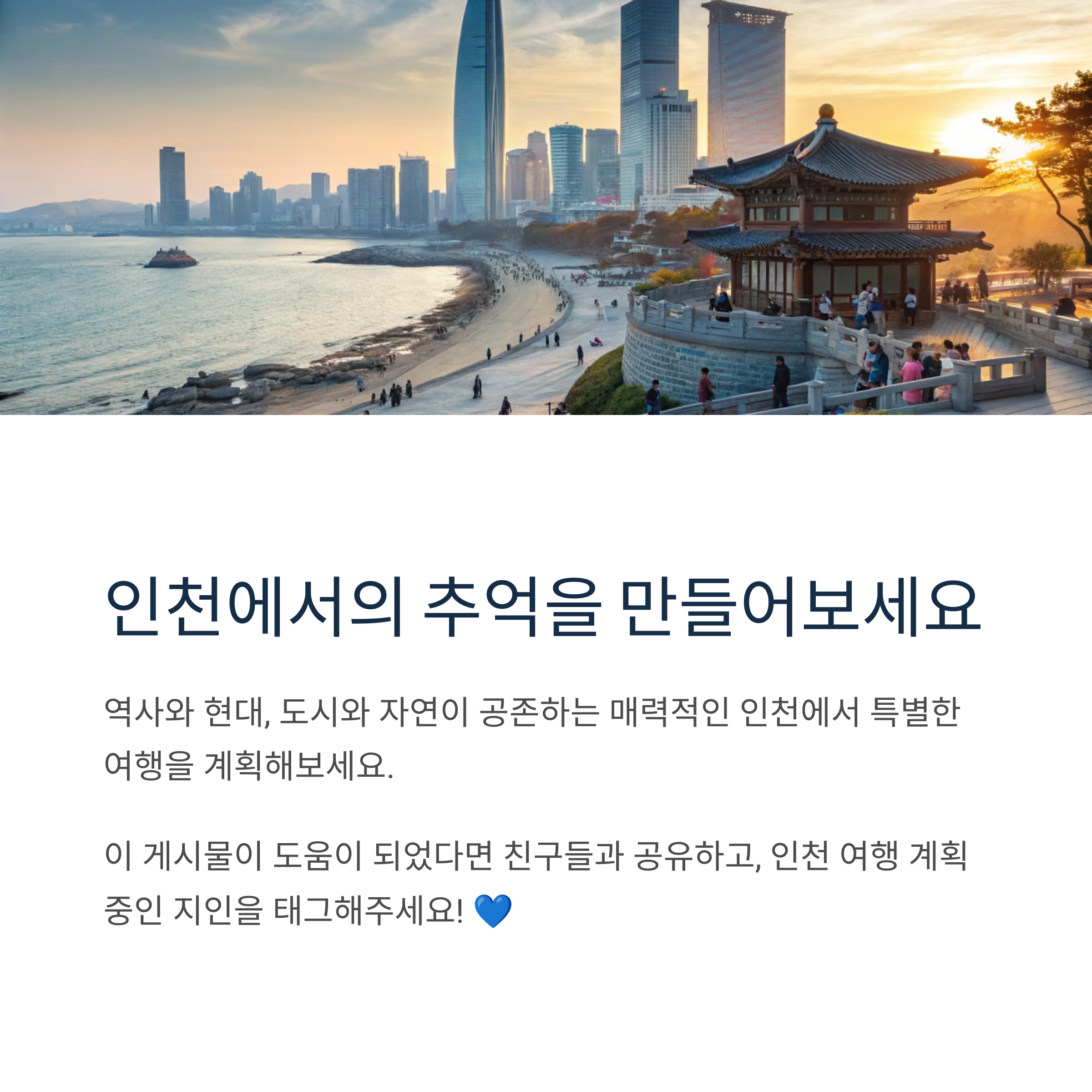 2025년, 인천은 더욱 매력적인 모습으로 여러분을 기다리고 있을 겁니다. 다채로운 볼거리, 맛있는 음식, 그리고 편안한 숙소까지 완벽하게 준비된 인천으로 떠나 잊지 못할 추억을 만들어 보세요! 😊