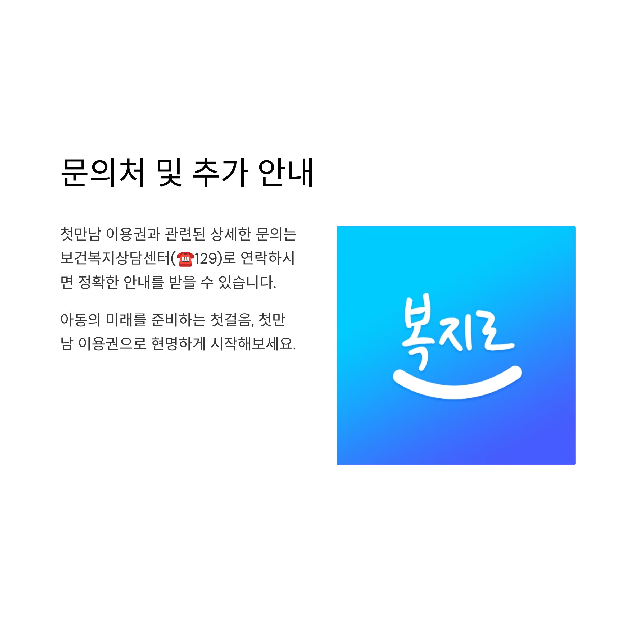 첫만남 이용권과 관련된 상세한 문의는 보건복지상담센터(☎129)로 연락하시면 정확한 안내를 받을 수 있습니다.