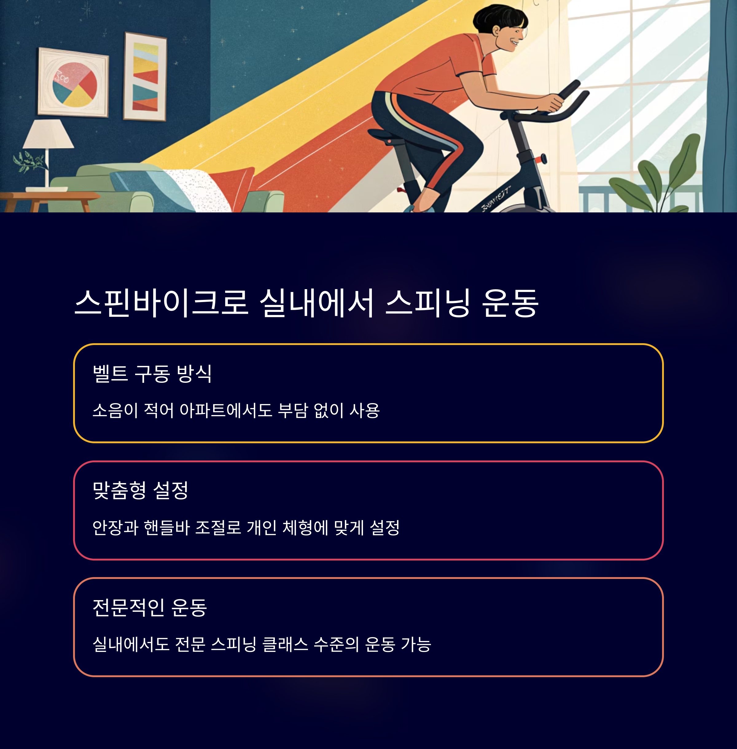 강도 높은 유산소 운동을 원하는 분들에게는 스핀바이크가 제격입니다.
