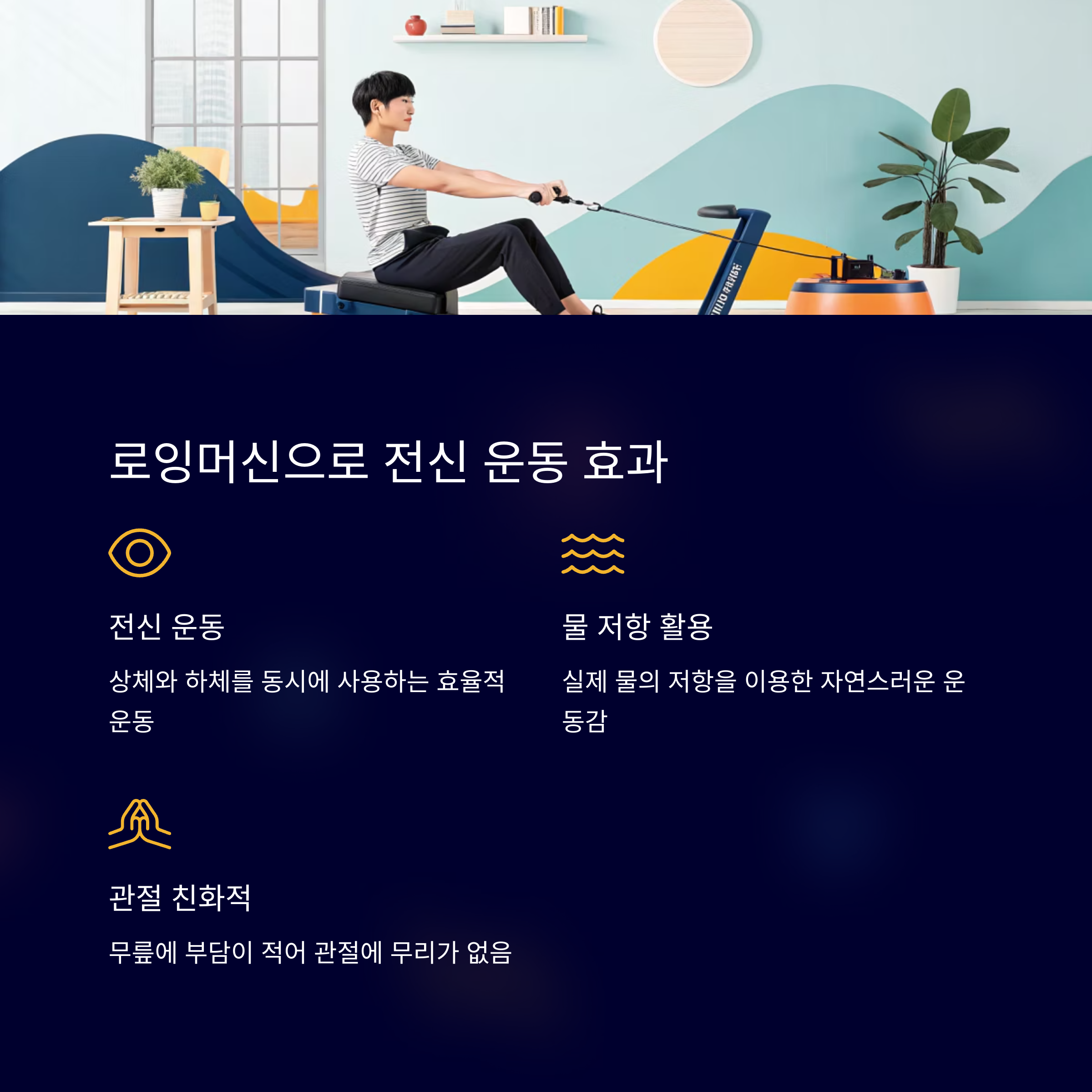 이고진 워터 샤크 로잉머신은 실제 물의 저항을 이용한 자연스러운 운동감을 제공합니다.