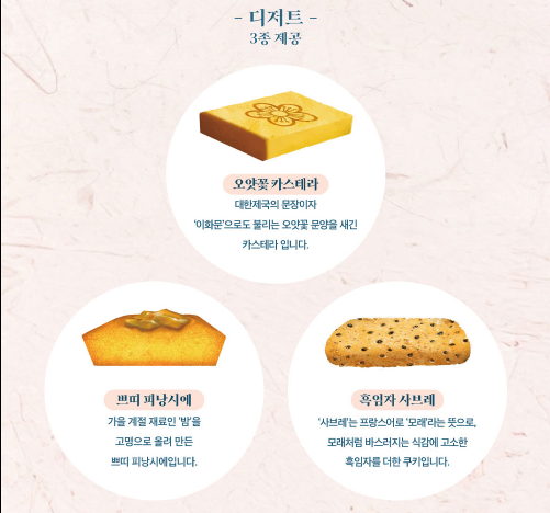 제공 디저트: 오렌지 파운드케이크, 무화과 피낭시에, 흑임자 사브레