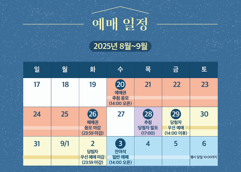 2025년 하반기 응모는 8월 20일부터 26일까지 진행되었고, 당첨자 발표는 8월 28일에 이루어졌습니다. 당첨자는 8월 29일부터 9월 2일까지 우선 예매를 할 수 있으며, 이후 남은 좌석은 9월 3일 오후 2시부터 행사 당일까지 선착순으로 예매가 가능합니다.