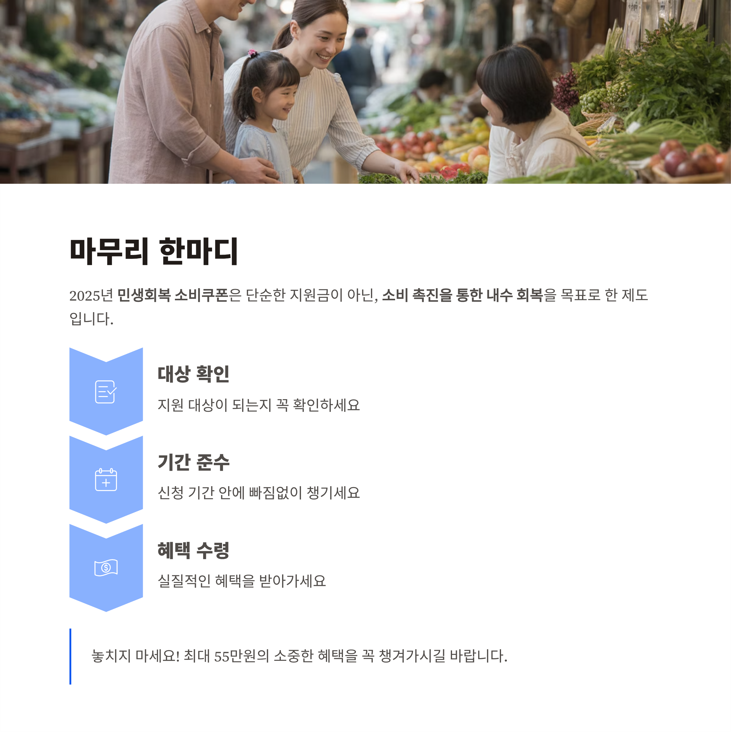 2025년 민생회복 소비쿠폰은 단순한 지원금이 아닌, 소비 촉진을 통한 내수 회복을 목표로 한 제도입니다.