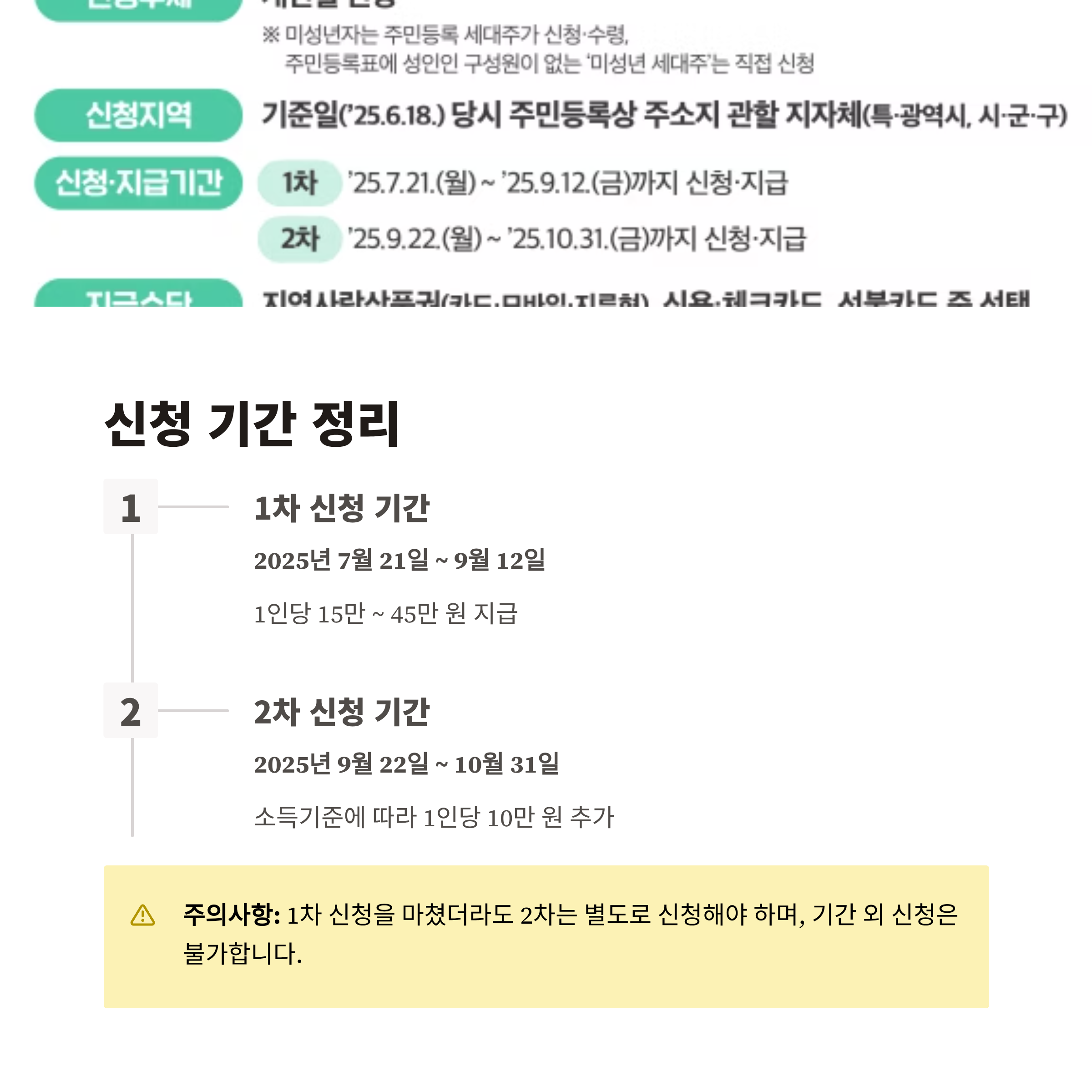 | 2차 신청 | 2025년 9월 22일 ~ 10월 31일 | 소득기준에 따라 1인당 10만 원 추가 |