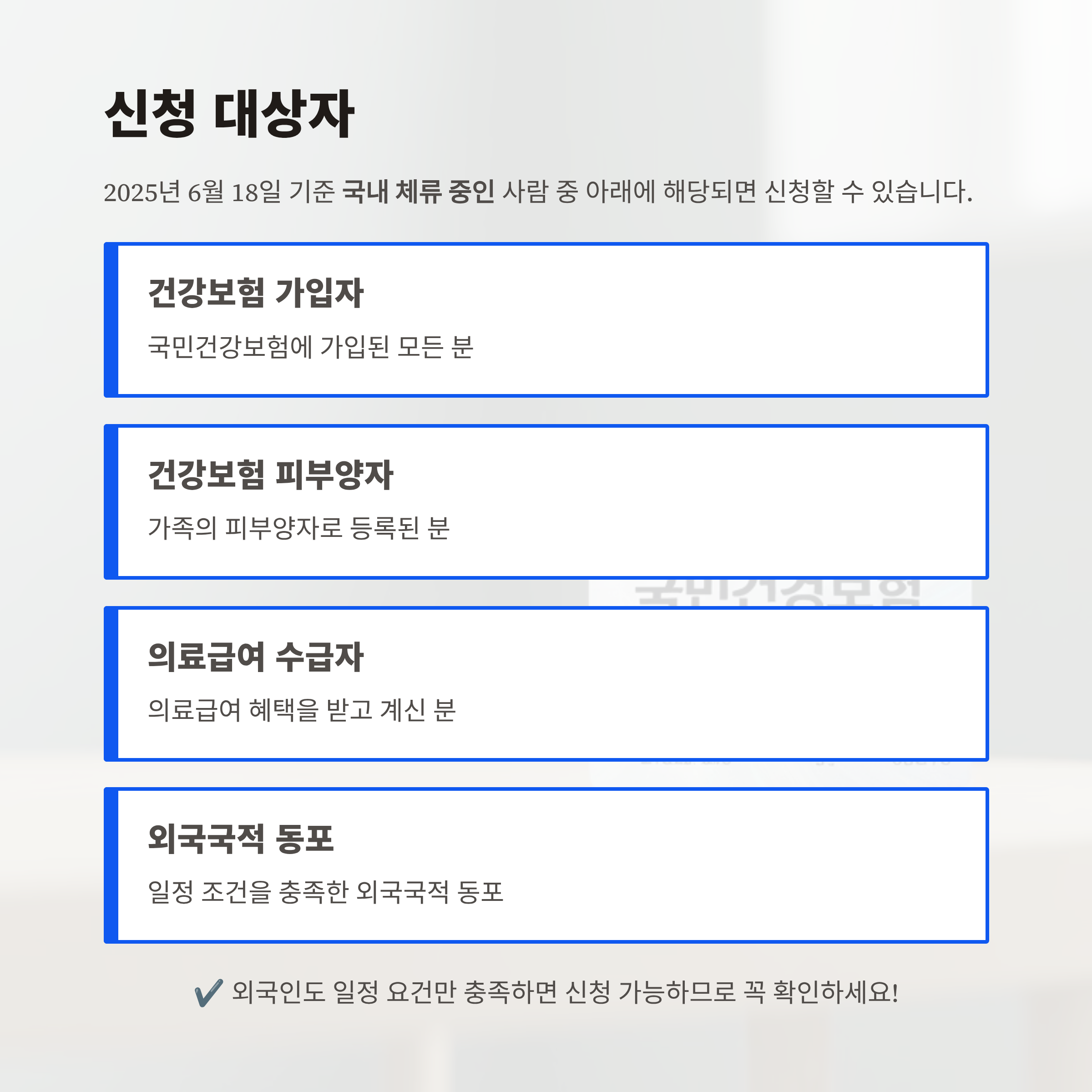 2025년 6월 18일 기준 국내 체류 중인 사람 중 아래에 해당되면 신청할 수 있습니다.