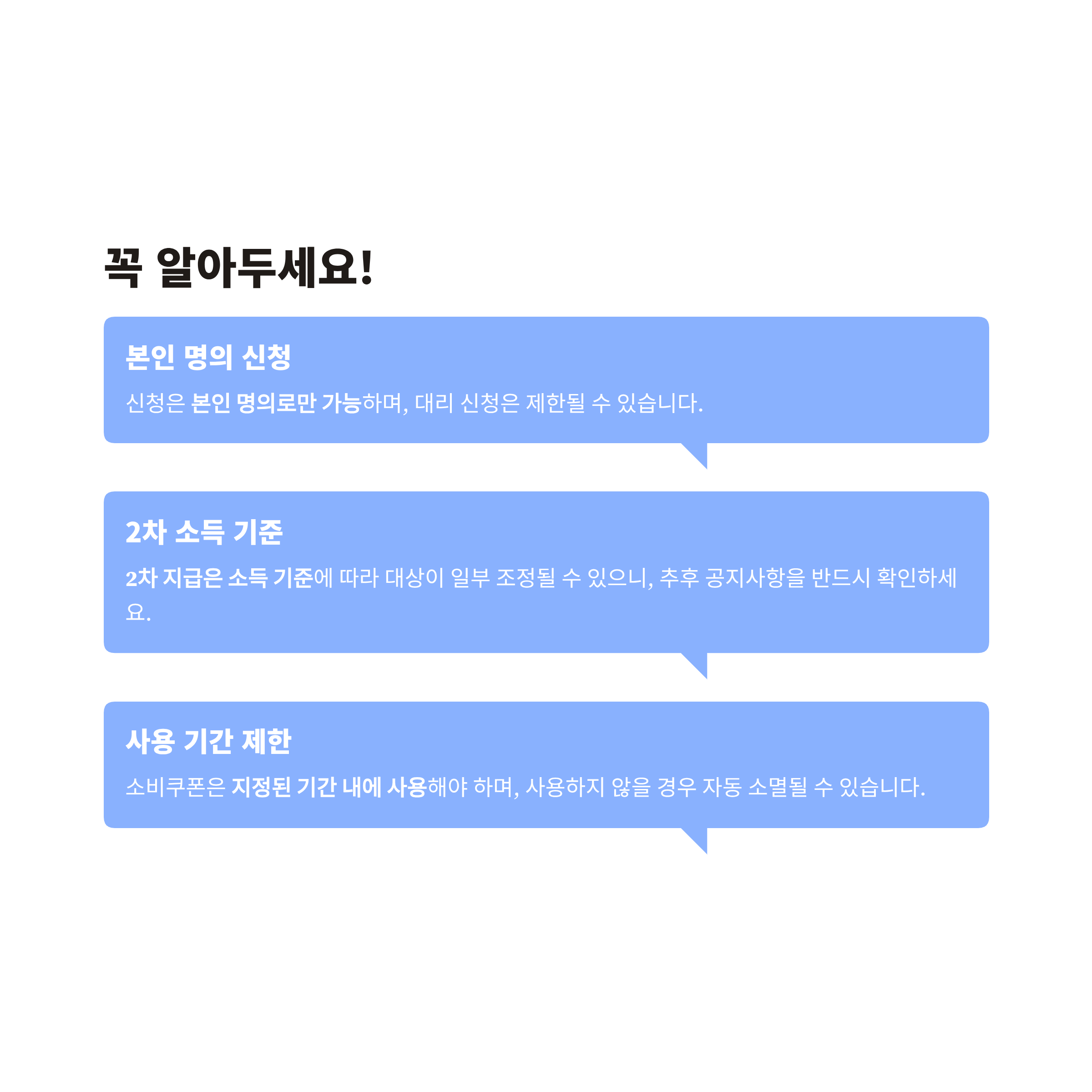 - 2차 지급은 소득 기준에 따라 대상이 일부 조정될 수 있으니, 추후 공지사항을 반드시 확인하세요.