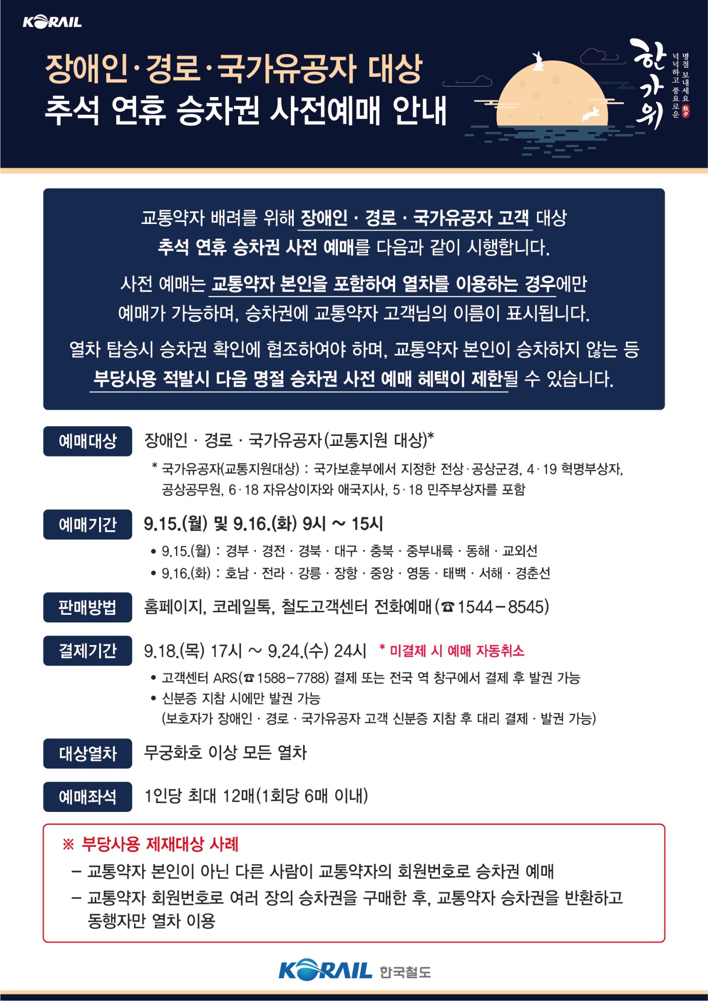 2025년 추석 기차표 예매 장애인 경로 국가유공자는 9월15일(월) 09:00 ~ 9월 16일(화) 15:00까지, 모든 국민은 9월 17일(수) 07:00 ~ 13:00, 9월 18일(목) 07:00 ~ 13:00 예정입니다.