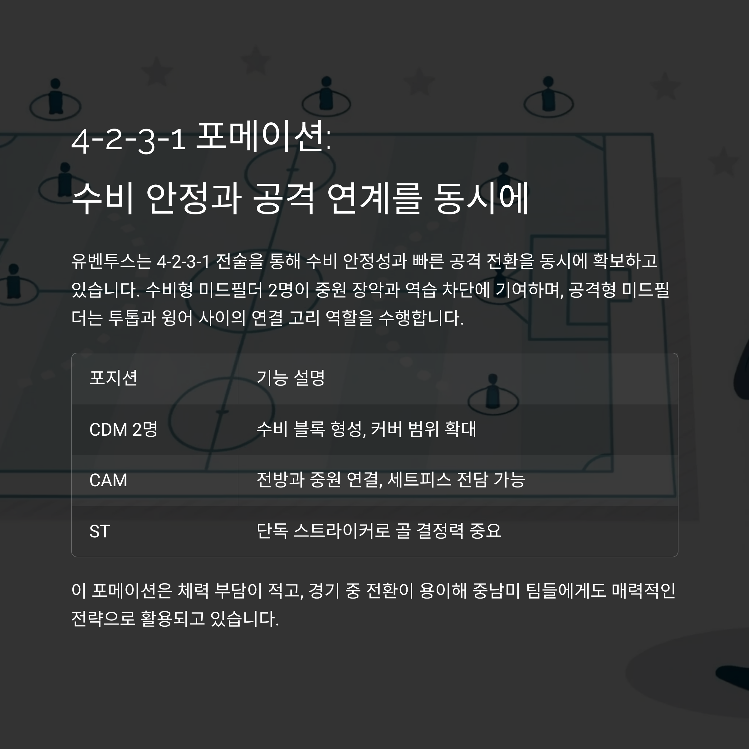 유벤투스는 4-2-3-1 전술을 통해 수비 안정성과 빠른 공격 전환을 동시에 확보하고 있습니다.